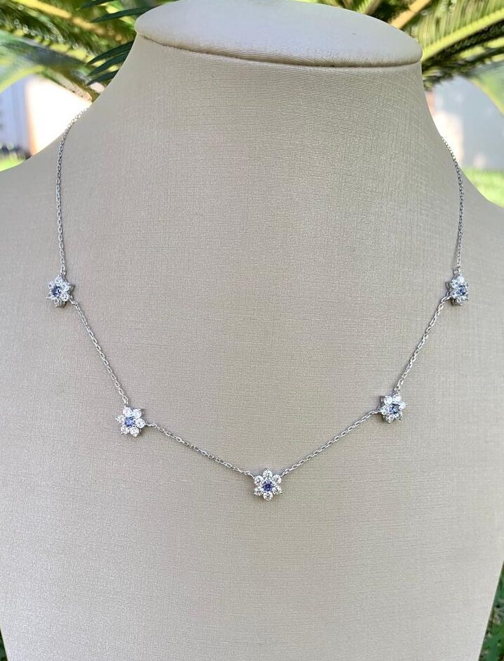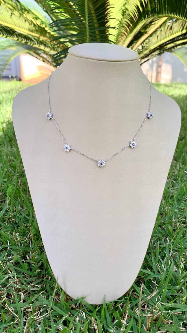 Colar 5 flores e 6 pétalas tanzanita e zircônia branca, em prata 925.