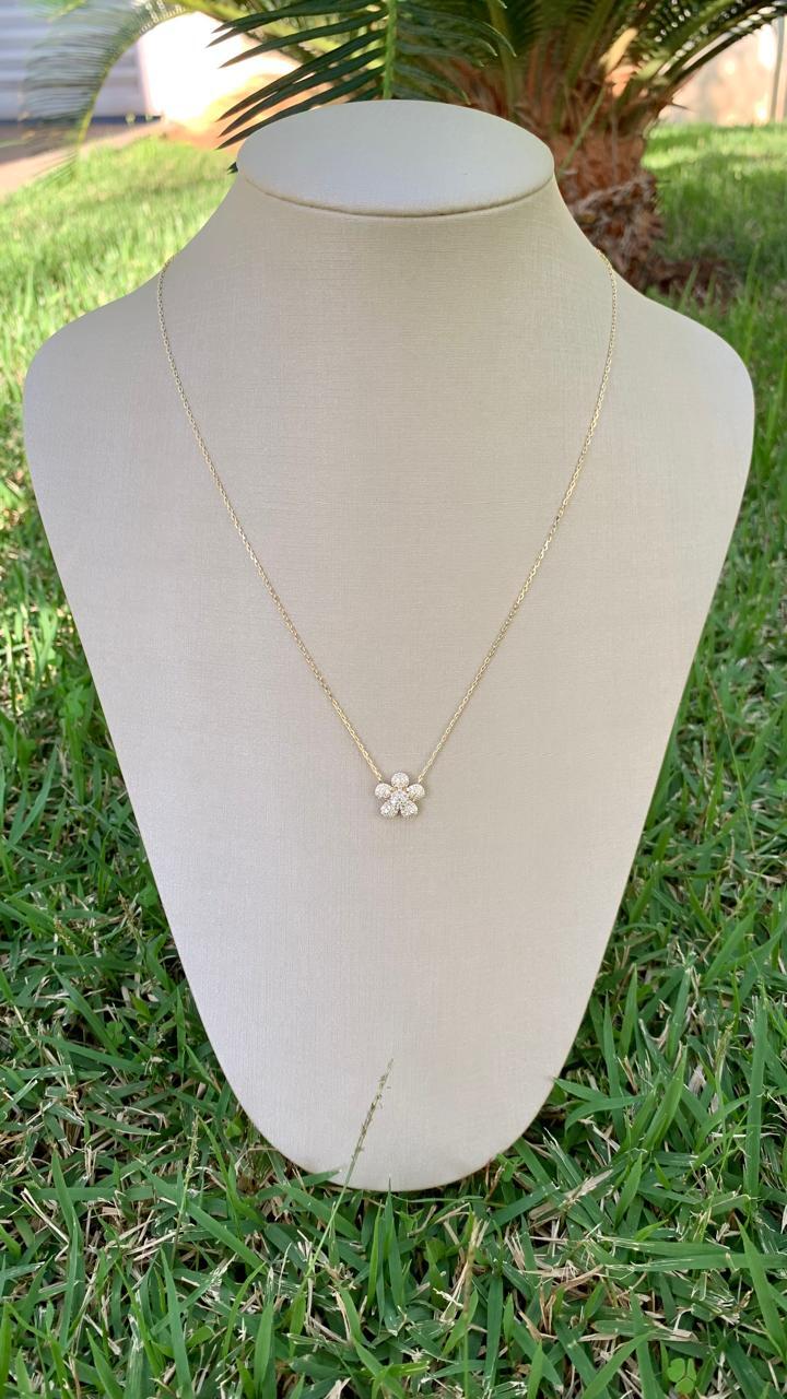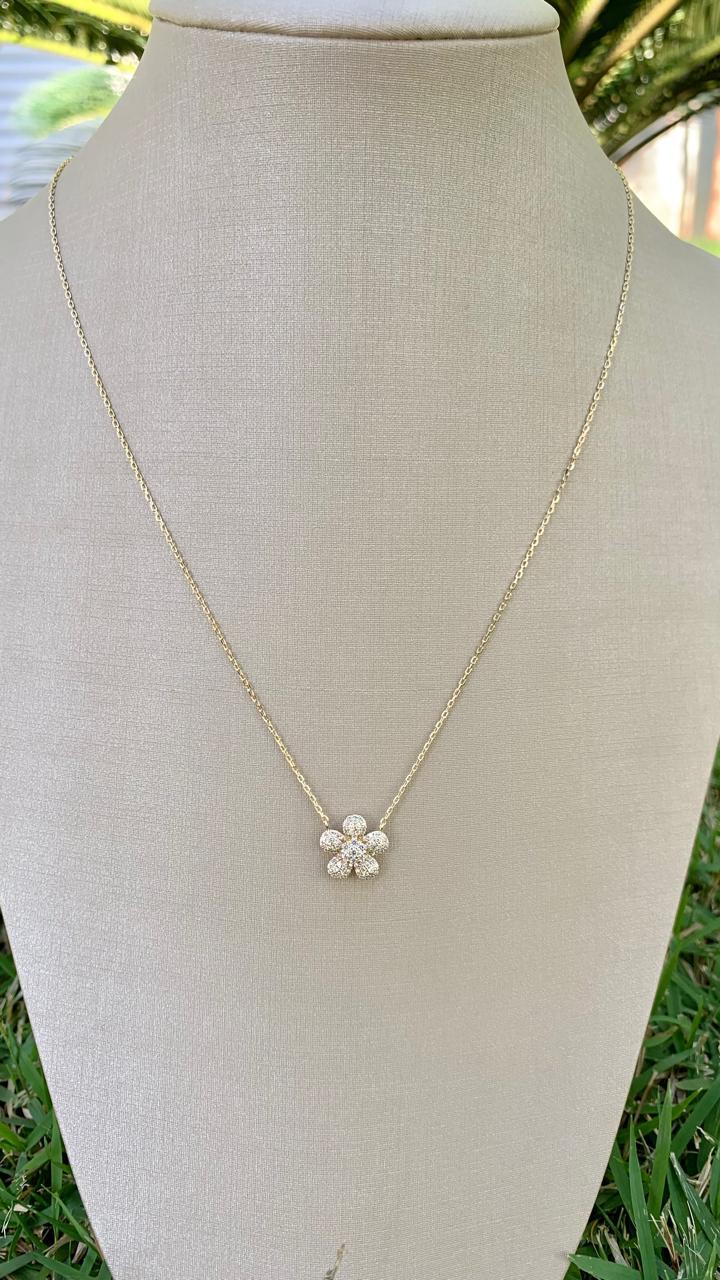 Colar 5 pétalas com miolo de flor cravejado com zircônias brancas, em prata 925 e banho de ouro18k.
