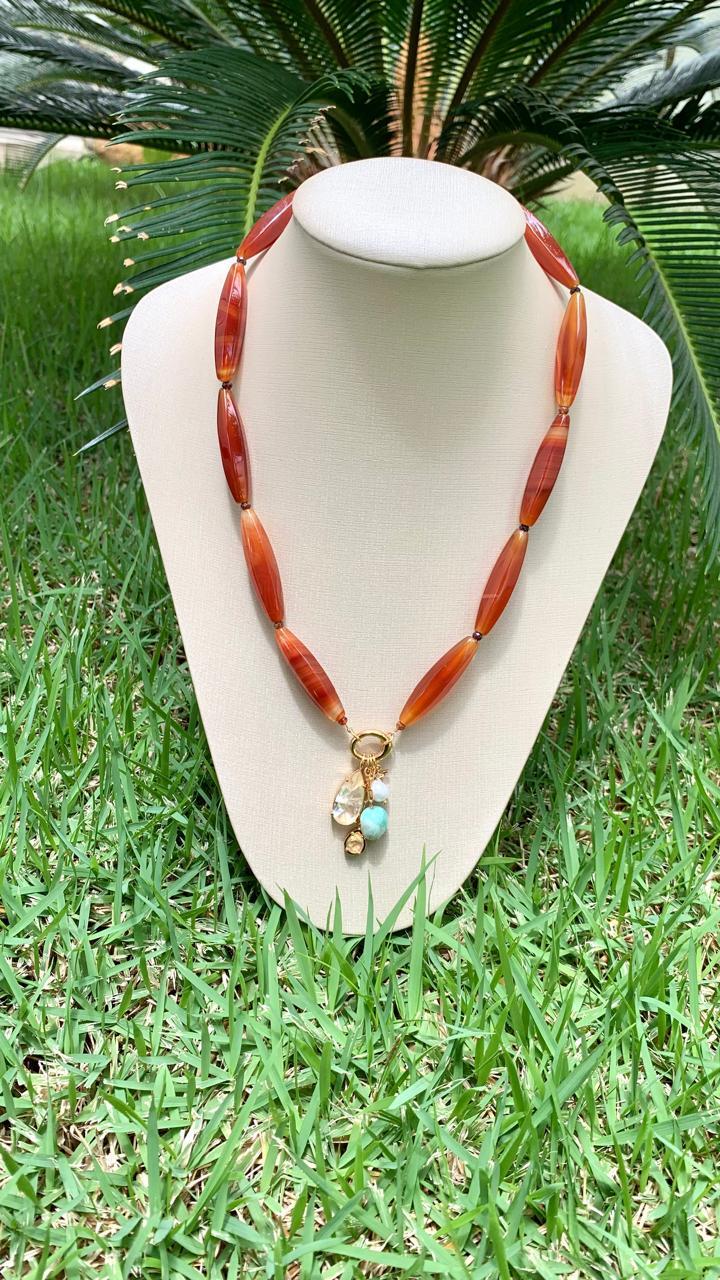 Colar Ágata fogo com pingentes de pedras naturais, banhado a ouro18k.
