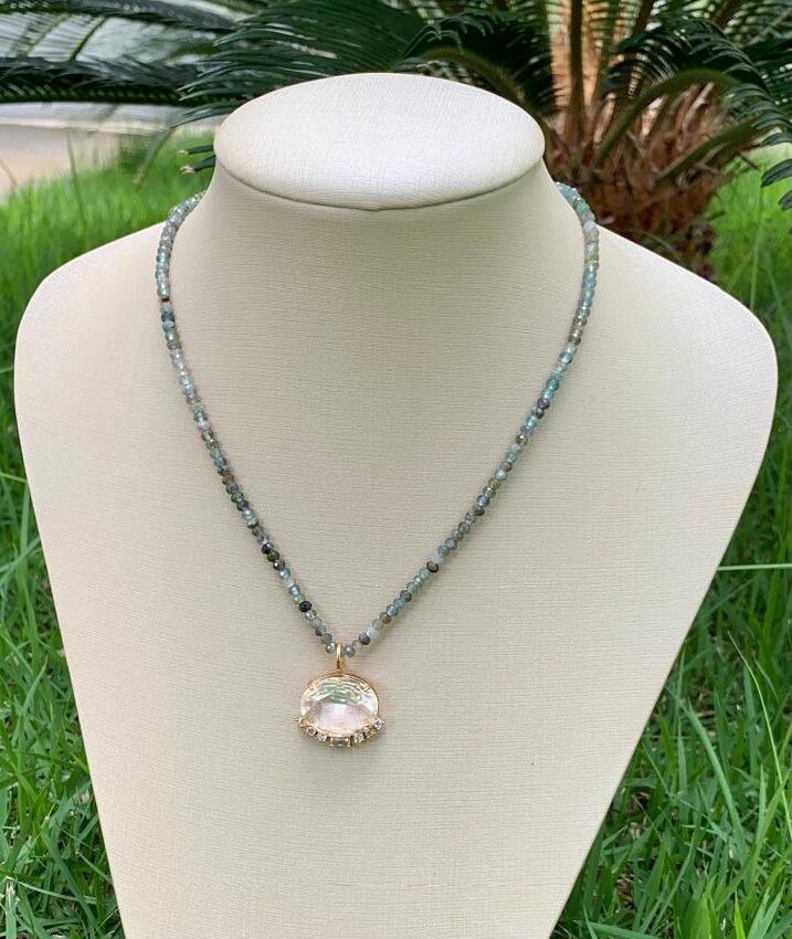 Colar água marinha com pingente de cristal cravejado de zircônias brancas, banhado a ouro18k.