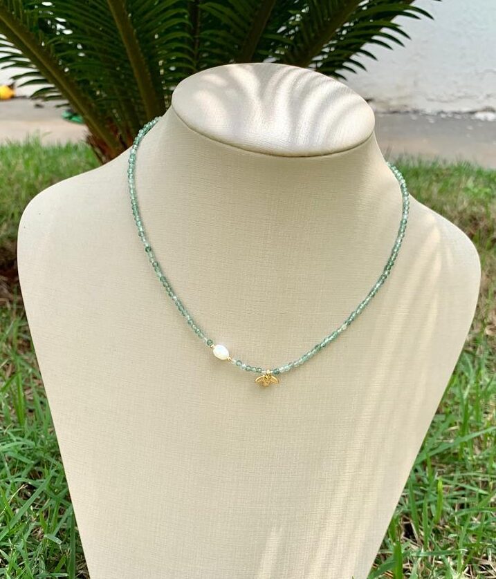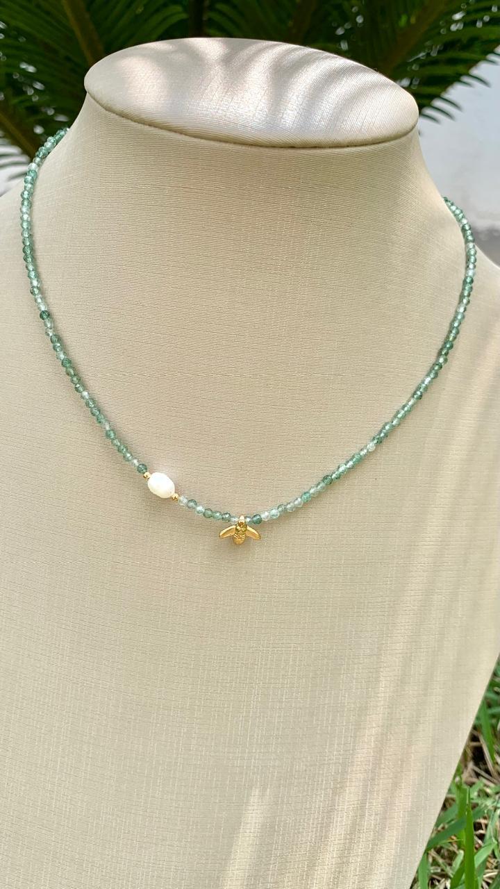 Colar pedra natural água marinha e pérola com pingente de abelha, banhado a ouro18k.