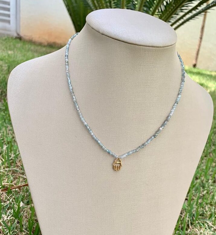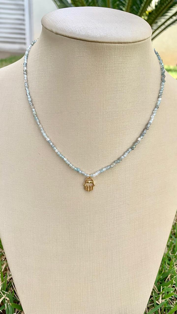Colar pedra natural água marinha com pingente mão de Fátima, banhado a ouro 18k.