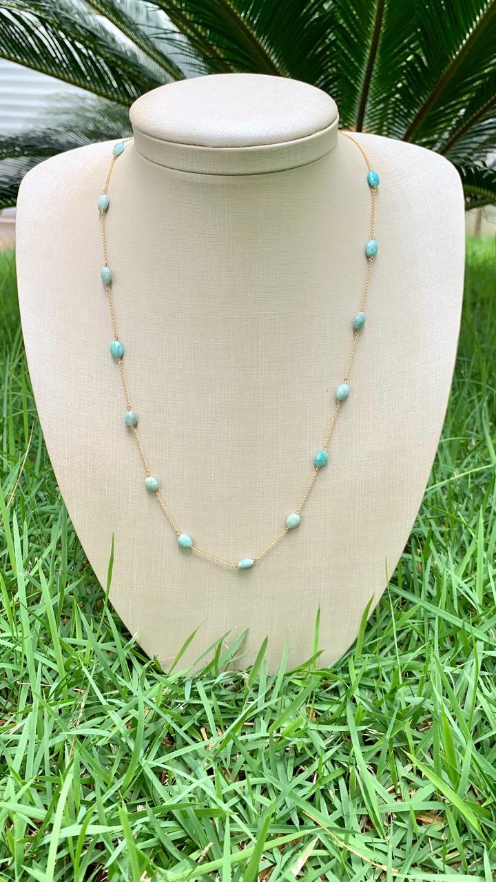 Colar de pedra natural amazonita, com 60cm de comprimento, banhado a ouro18k.