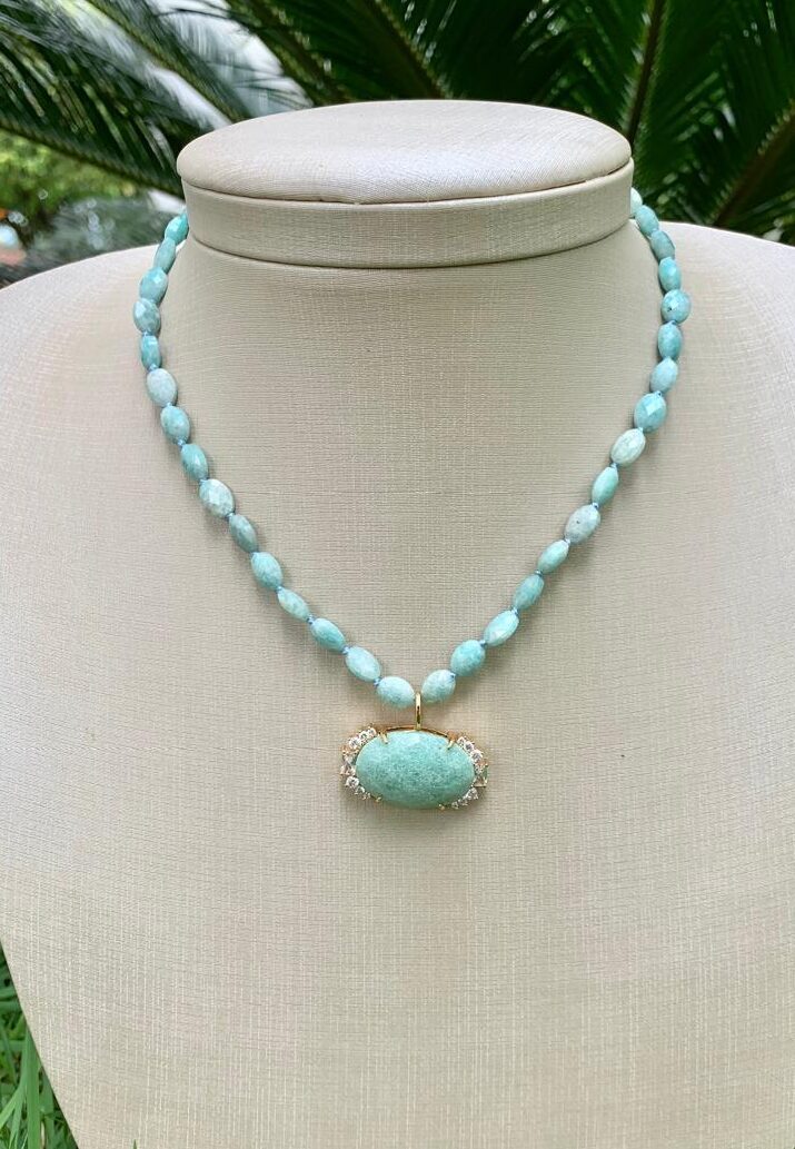 Colar de pedra natural amazonita com zircônias brancas no pingente, banhado a ouro18k.