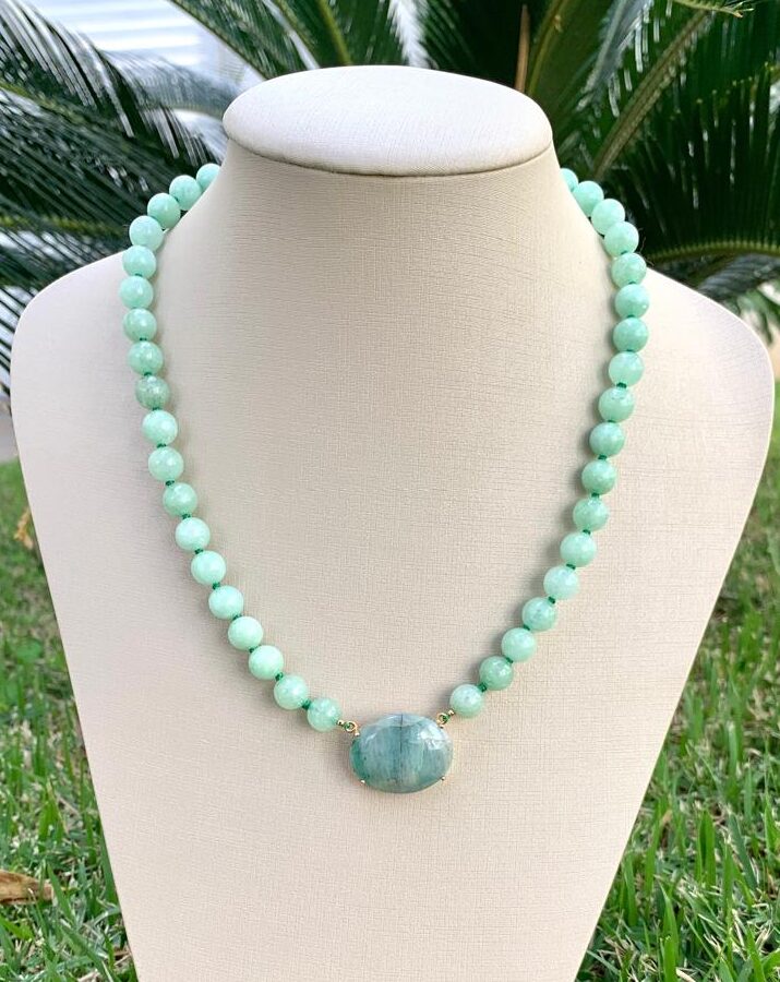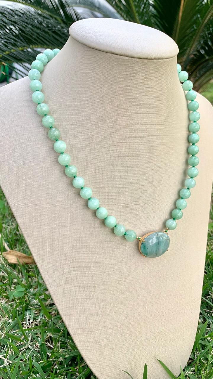 Colar de amazonita, com 45cm de comprimento banhado a ouro 18k.