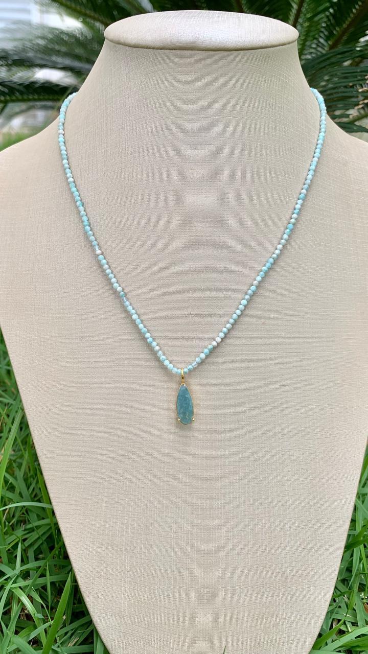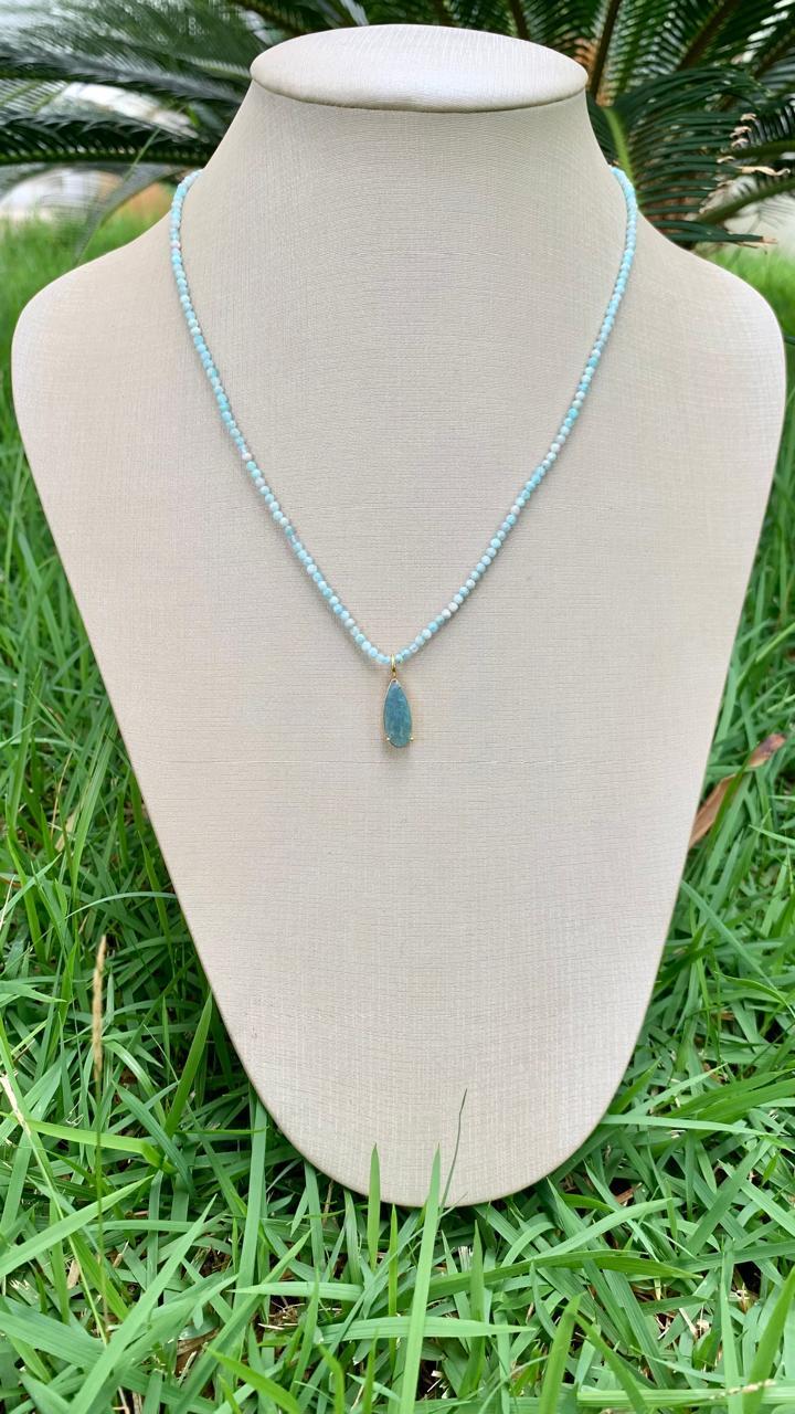Colar amazonita com pingente apatita azul, banhado a ouro18k.