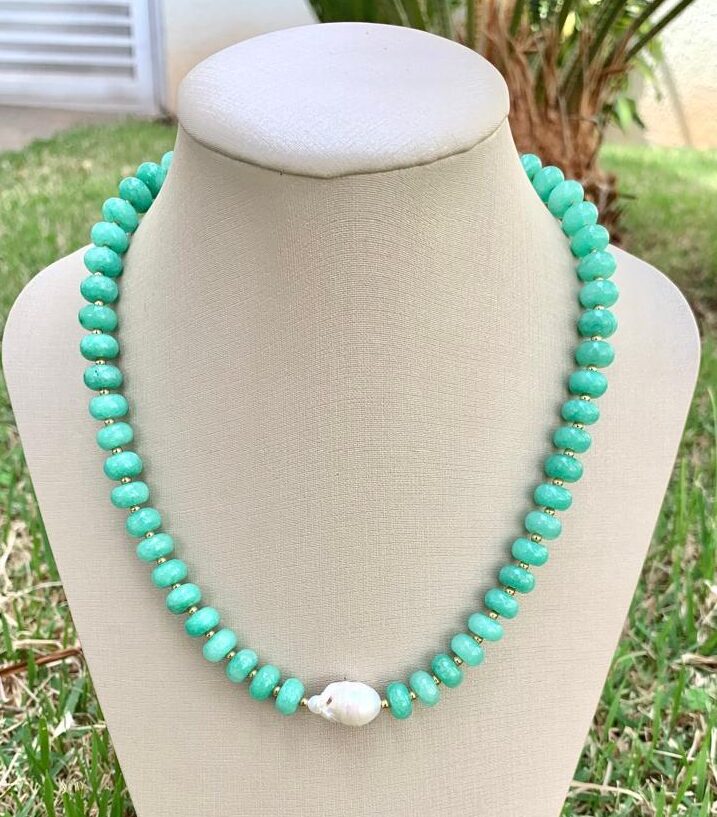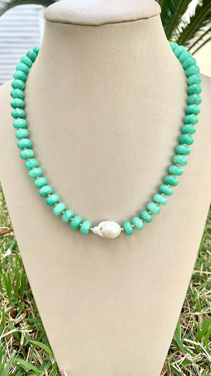 Colar pedras naturais amazonita com pingente de pérola, banhado a ouro 18k.