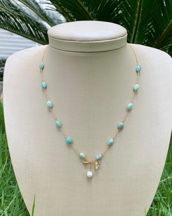 Colar amazonita com pingente de pérola, Espirito Santo e cristal, banhado a ouro18k.
