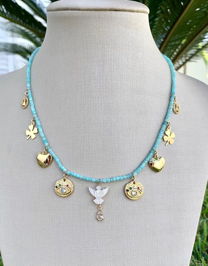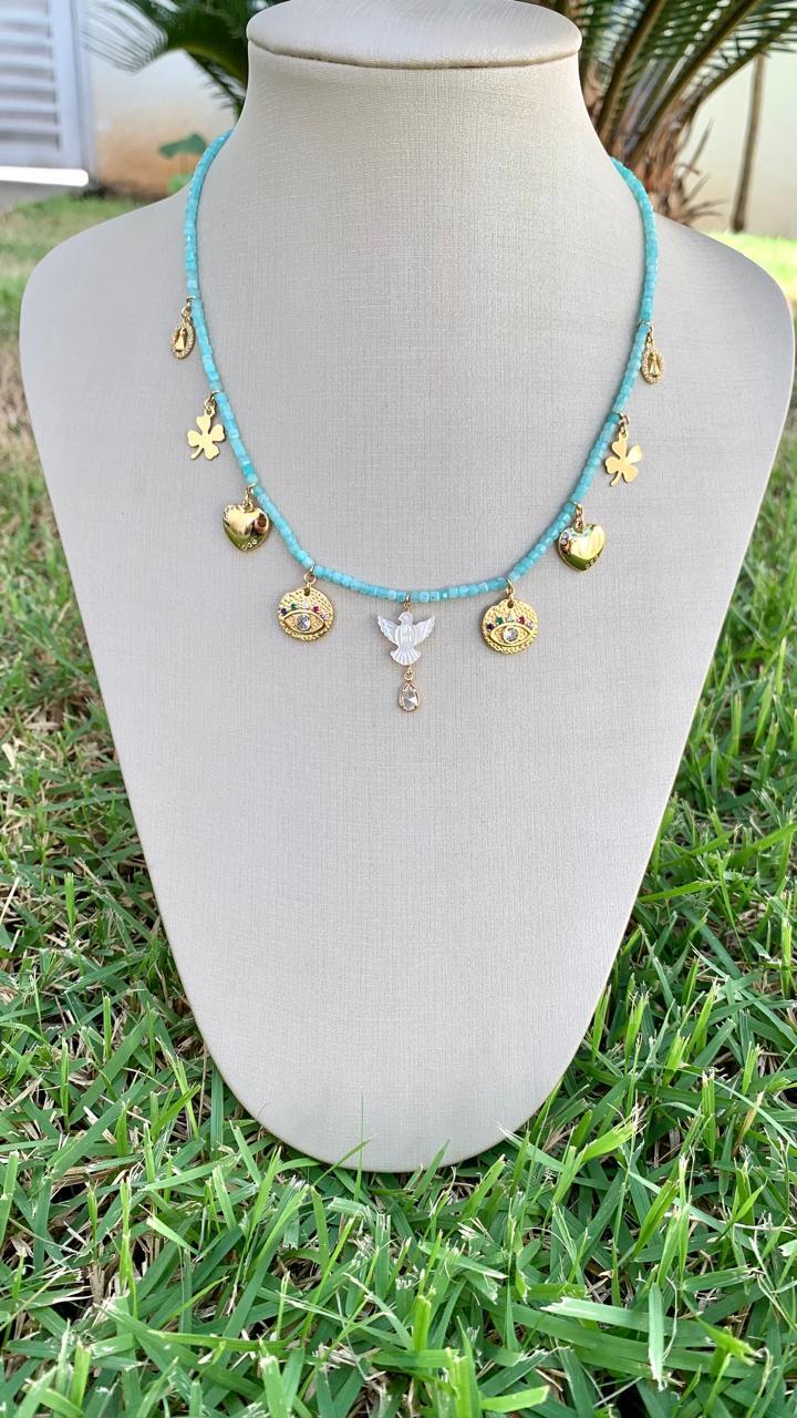 Colar de pedra natural amazonita com pingentes diversos, banhado a ouro18k.