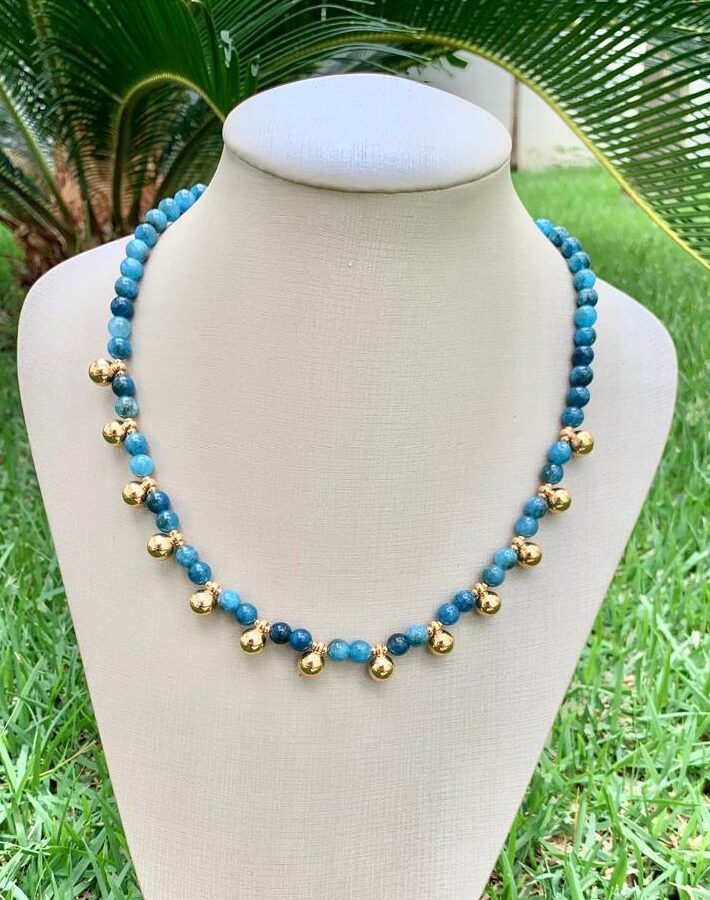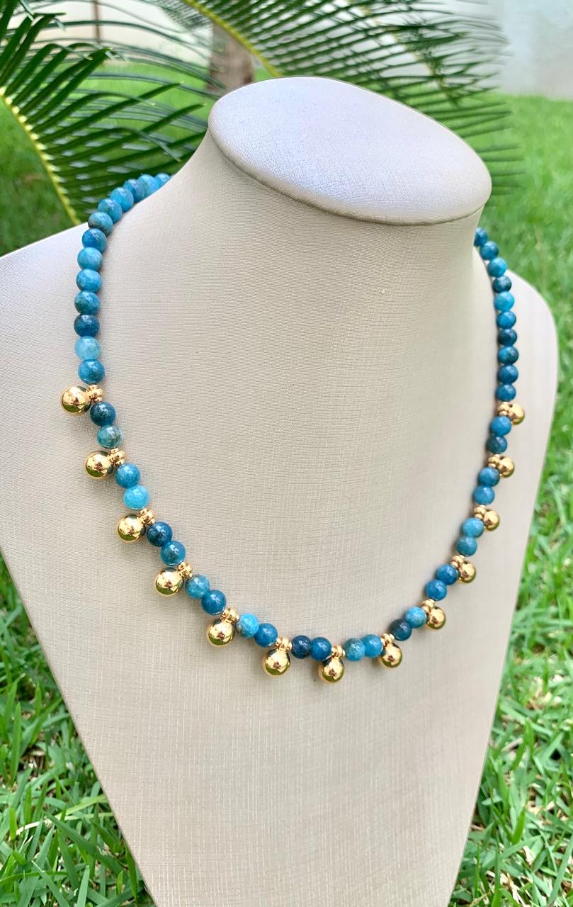 Colar com 45cm de comprimento, de pedra natural apatida com esferas banhadas a ouro 18k. Fecho lagosta.