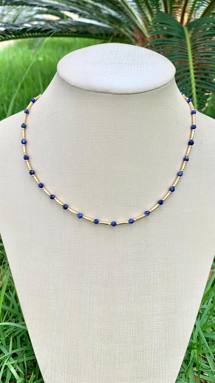 Colar canutilho com pedra natural lápis lazuli, banhado a ouro18k.