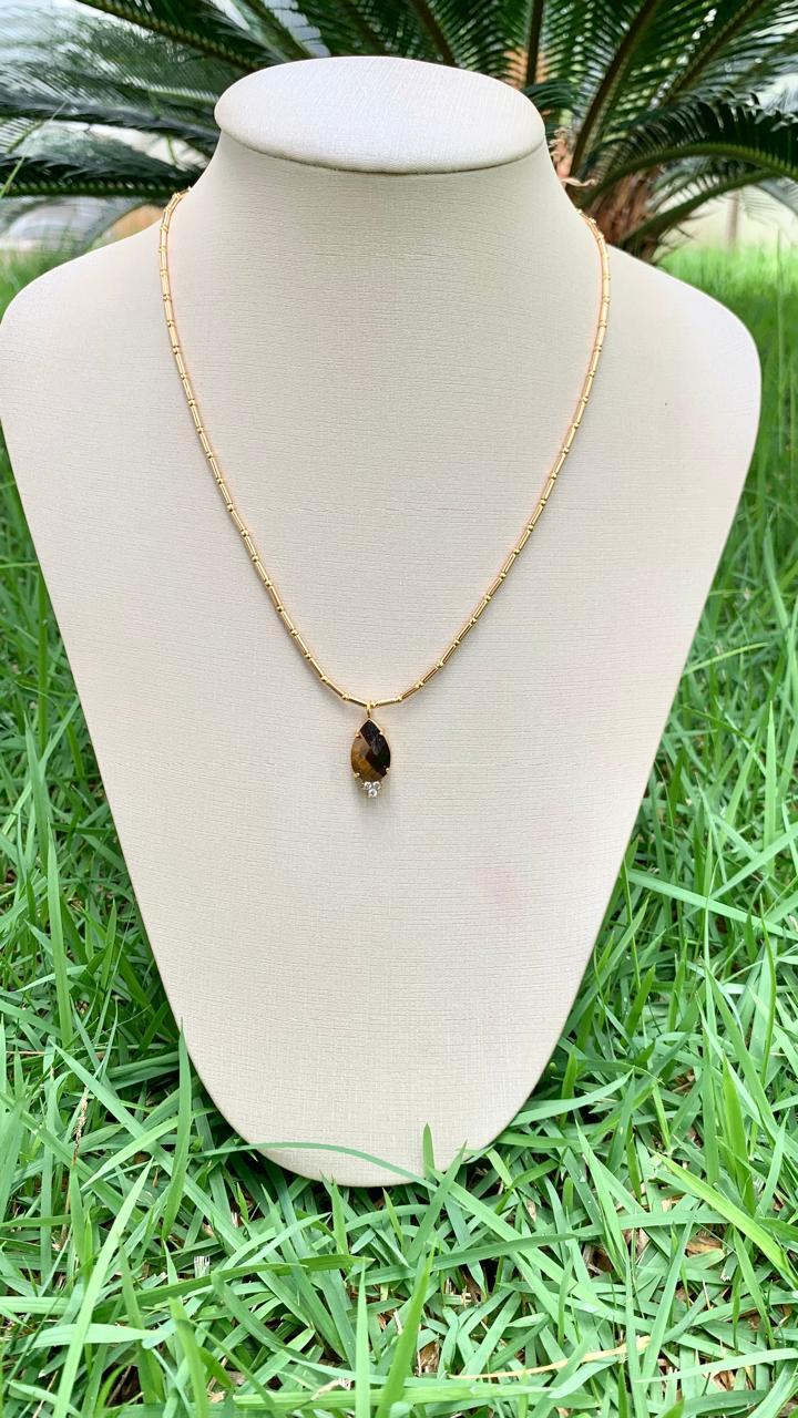 Colar canutilho com pingente de gota na pedra olho de tigre e 3 zircônias  brancas, banhado a ouro18k.