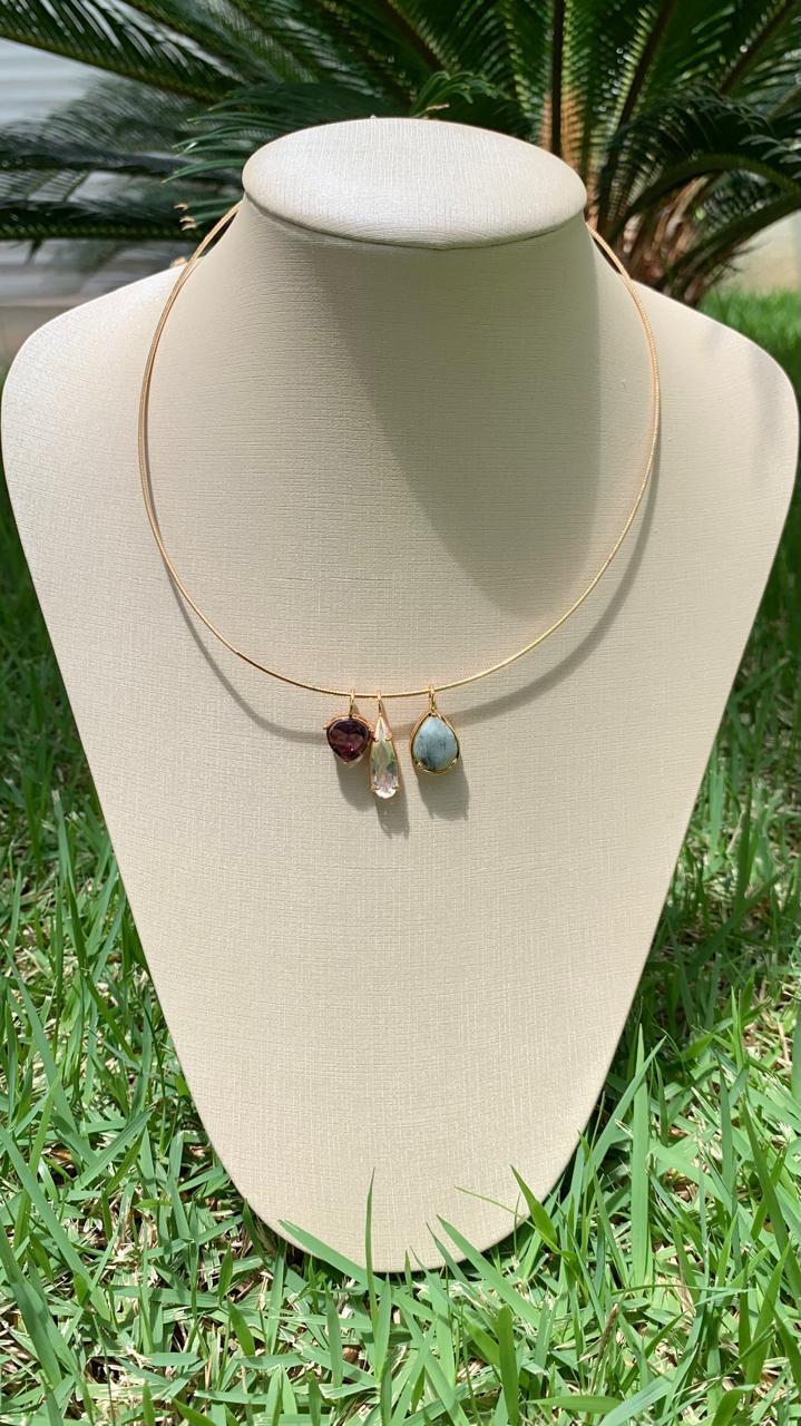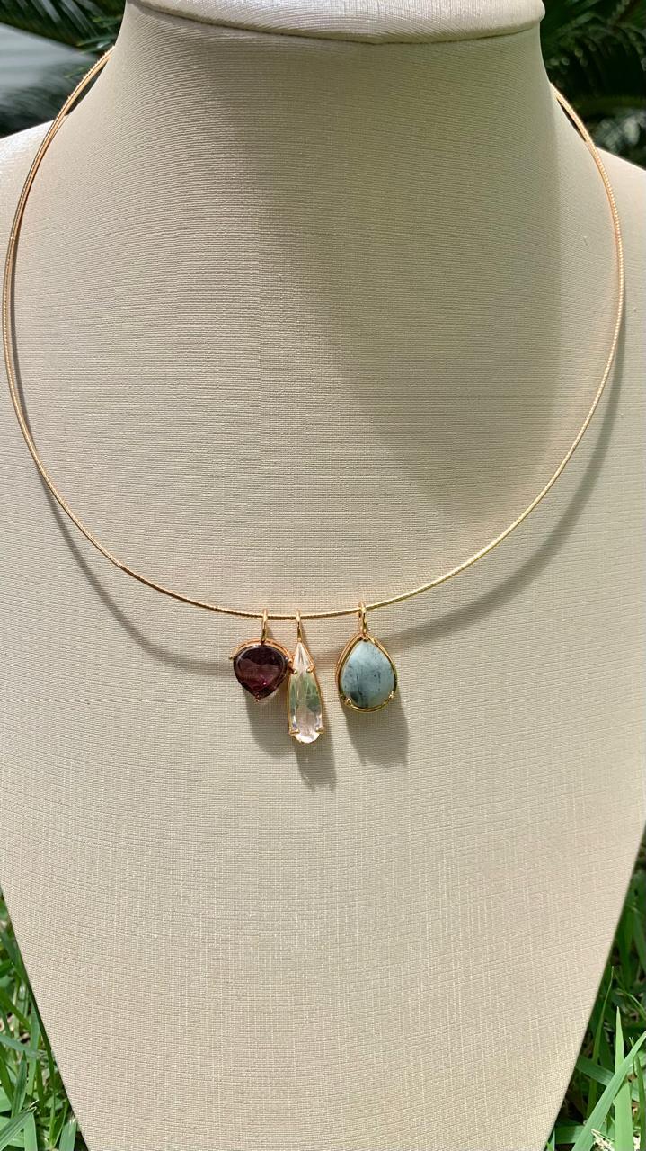 Aro com pingentes de ametista, cristal e esmeralda, banhado a ouro18k.