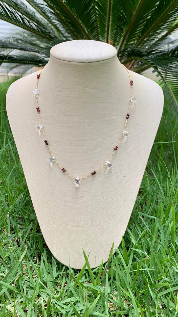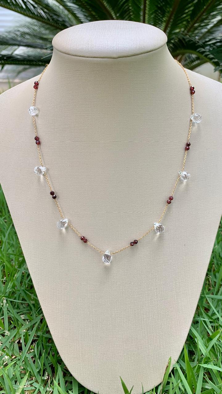 Colar com pingentes de cristal e pedra natural granada, banhado a ouro18k.