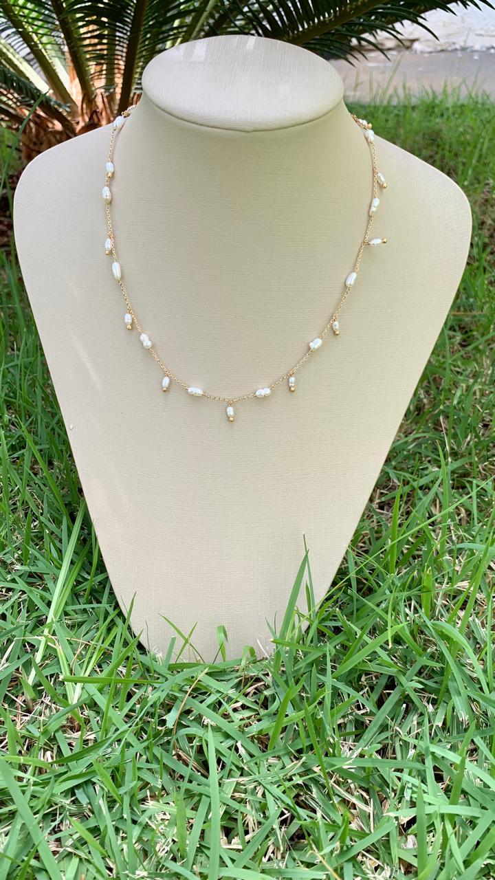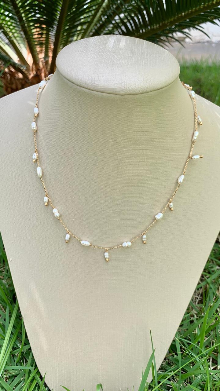 Colar com pingentes de pérola natural, banhado a ouro18k.