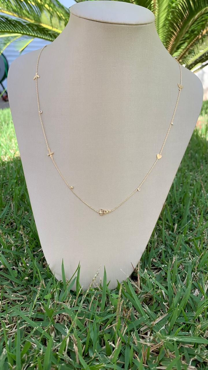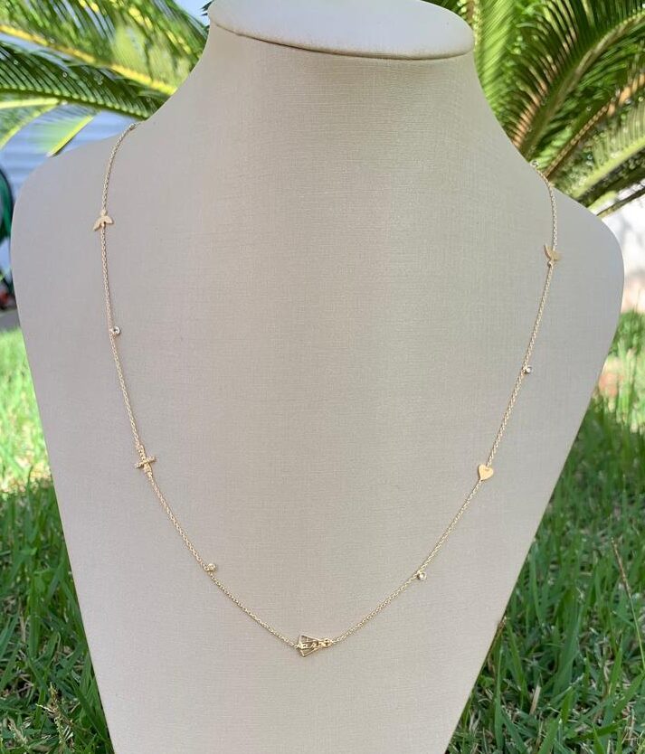 Colar com símbolos religiosos, 90cm, banhado a ouro18k.