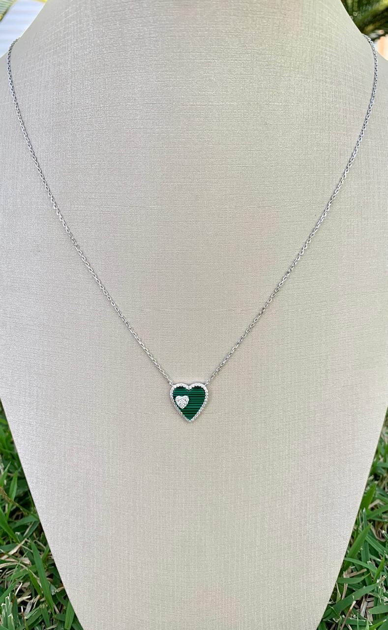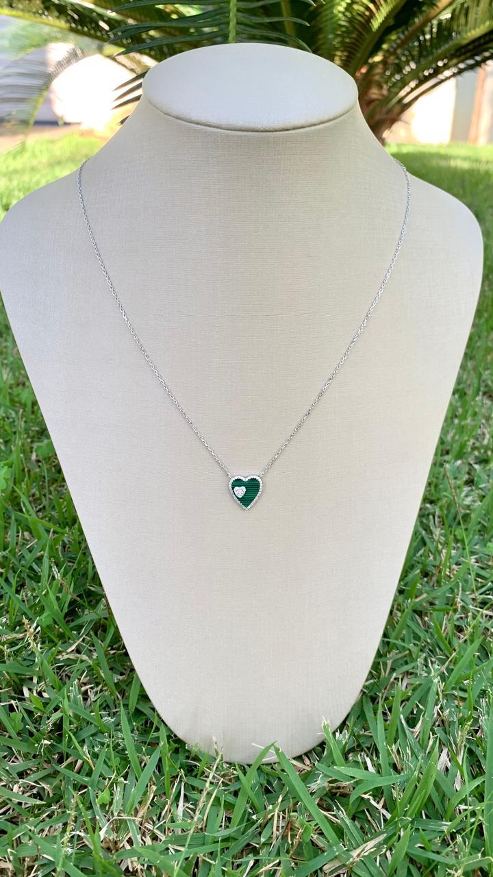 Corrente elos portugueses com coração esmaltado em malaquita cravejado com zircônias brancas ao redor, em prata 925.