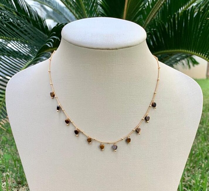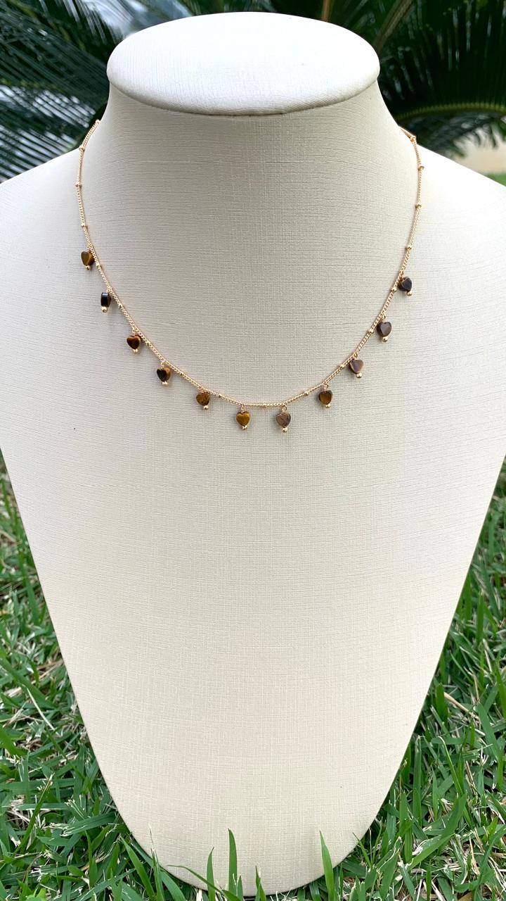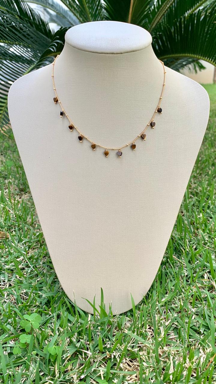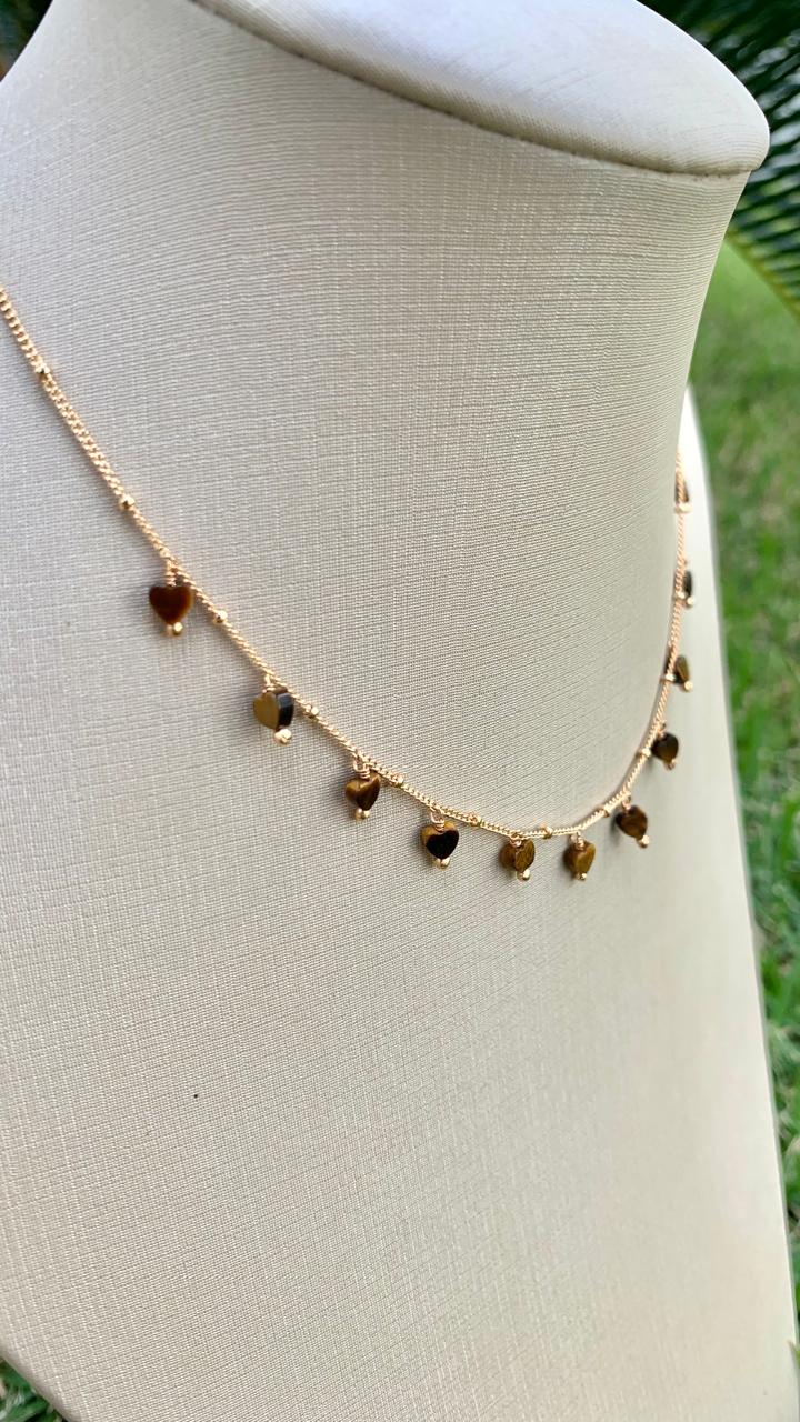 Colar com pingentes de coração de olho de tigre, banhado a ouro 18k.