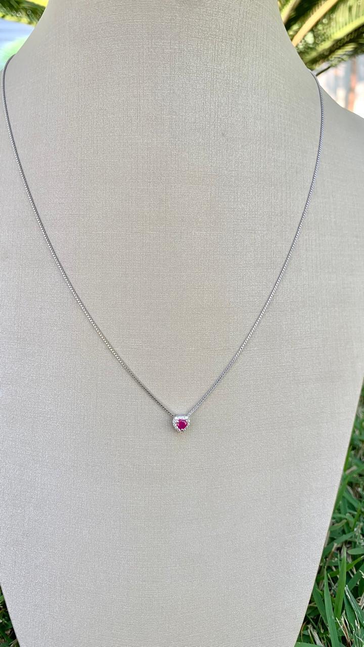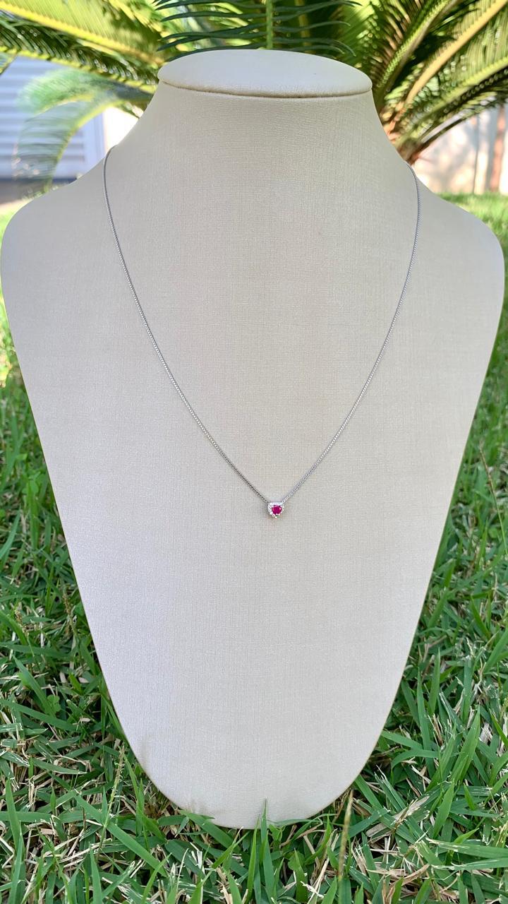 Colar coração rubi 3mm cravejado de zircônias brancas ao redor, em prata 925.