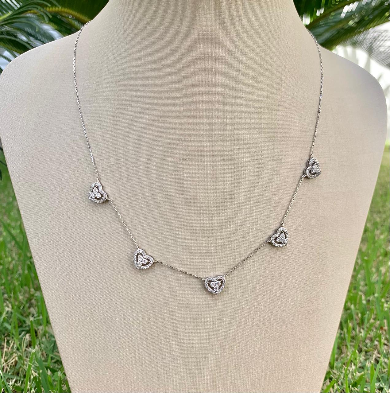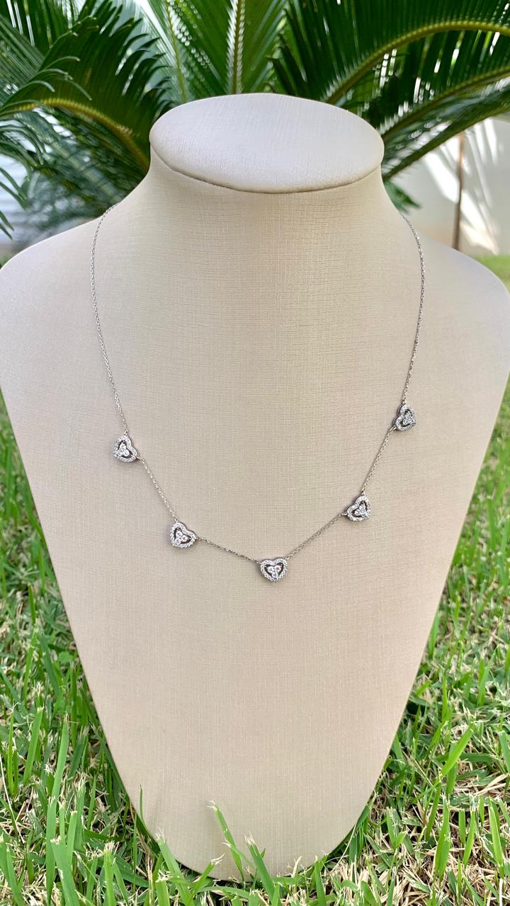 Colar em prata 925, com 5 corações vazados, com três zircônias no centro dos corações, cravejado de zircônias.