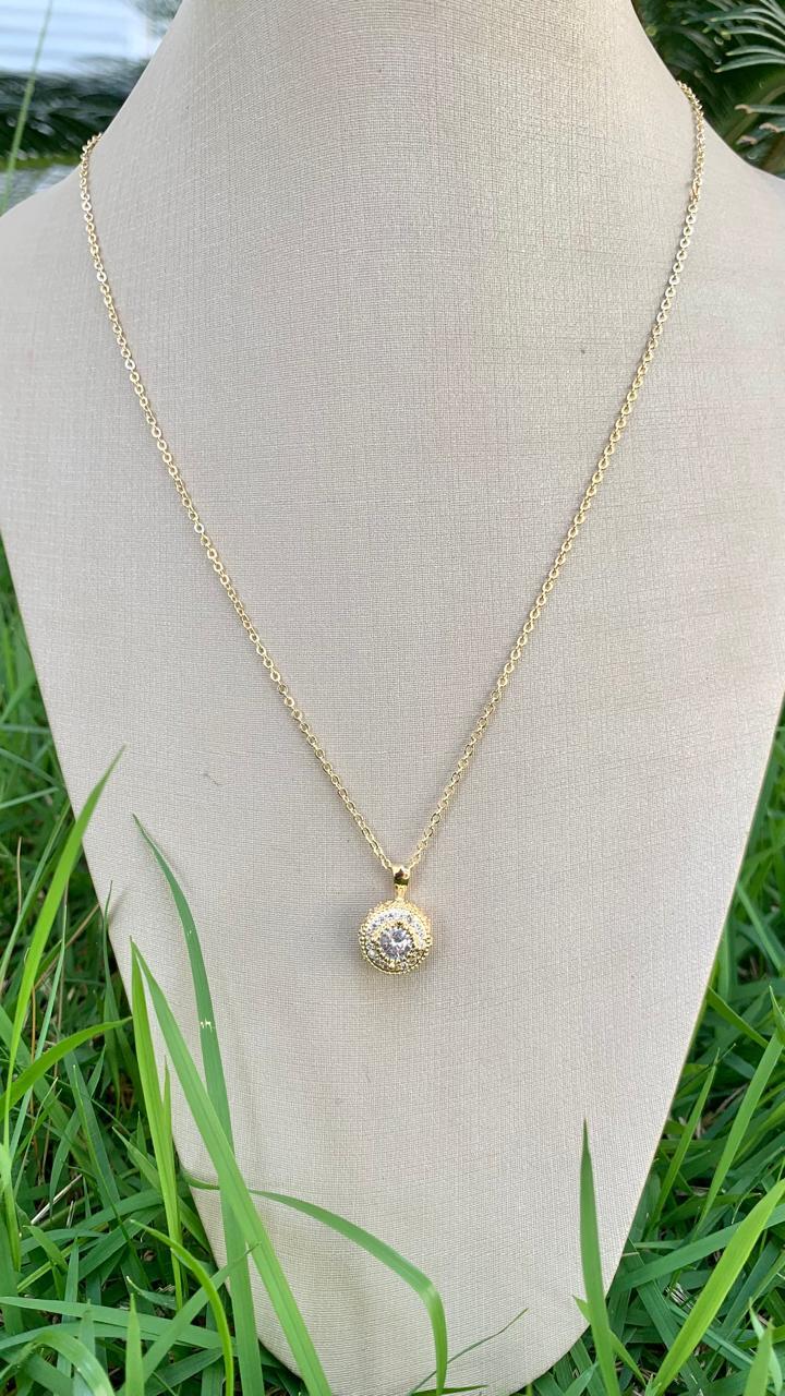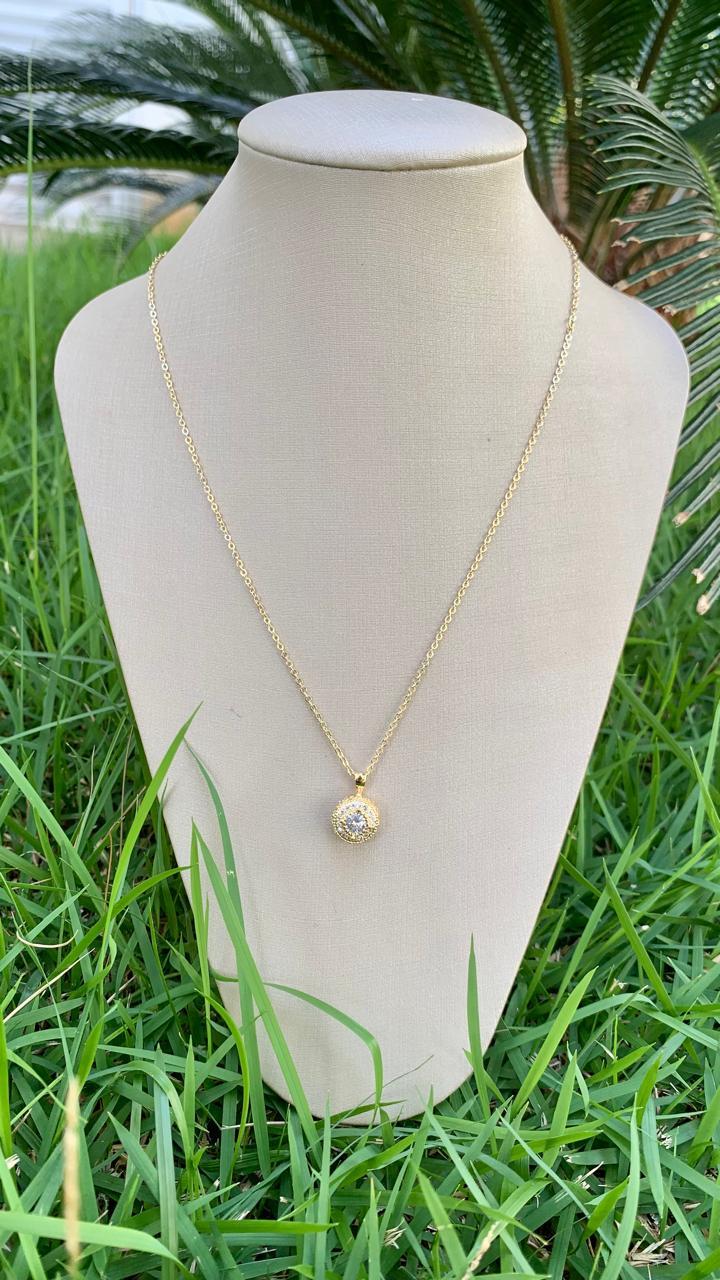Colar coroa com zircônias brancas, com 50cm de comprimento, banhado a ouro18k.