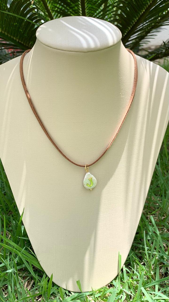 Colar courinho com pingente de pérola letra J, banhado a ouro18k.