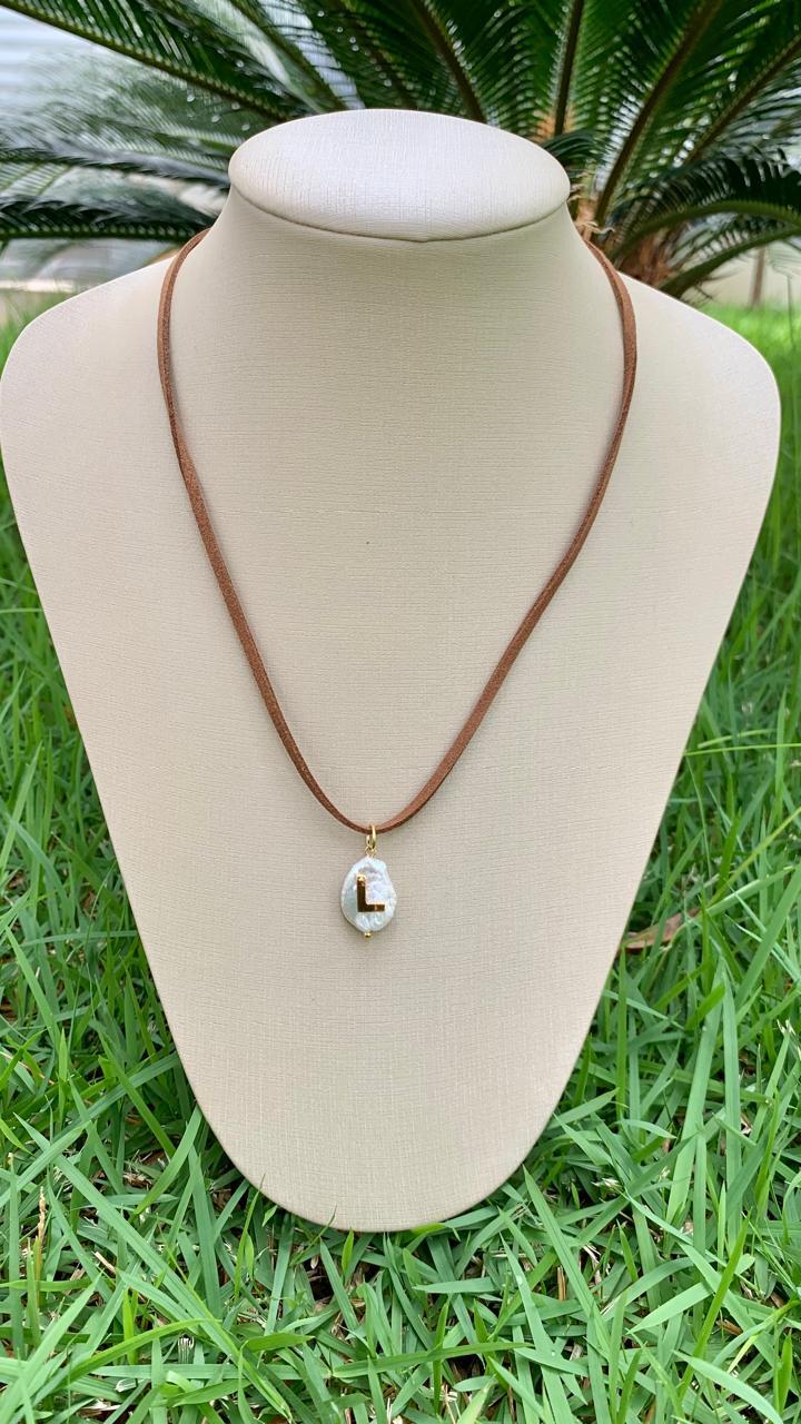 Colar courinho com pingente de pérola letra L, banhado a ouro18k.