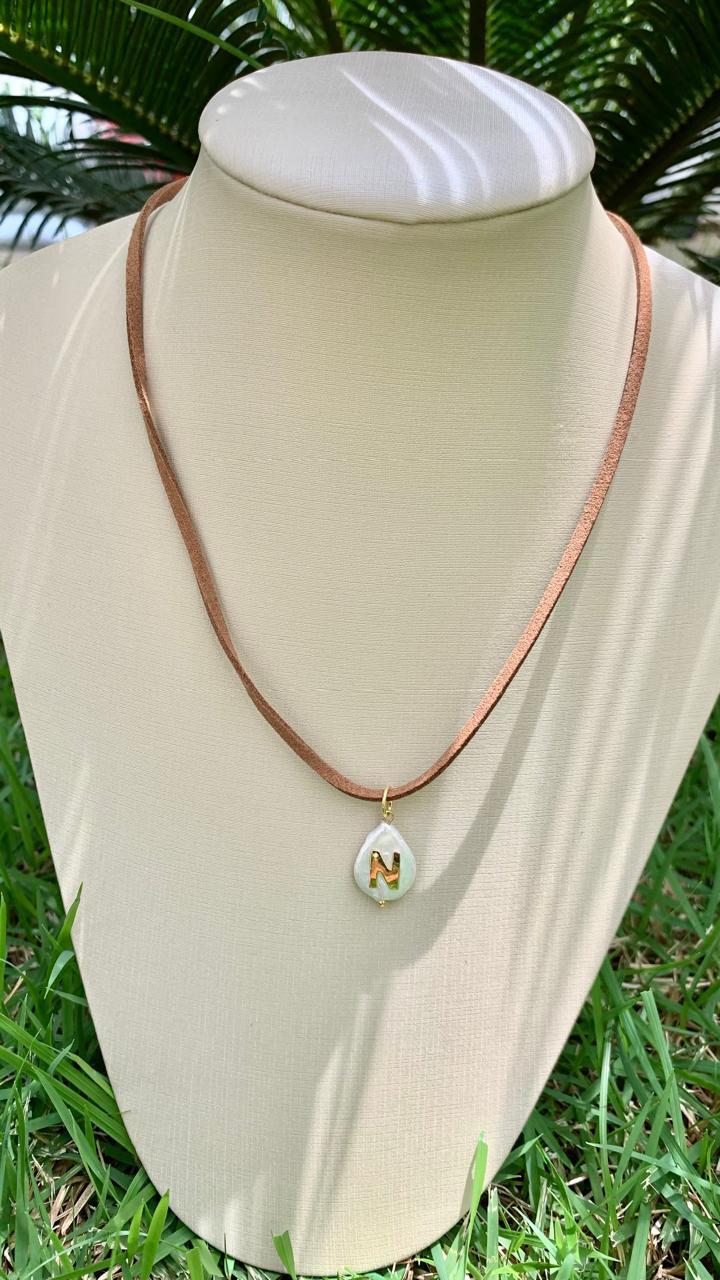Colar courinho com pingente de pérola letra N, banhado a ouro18k.