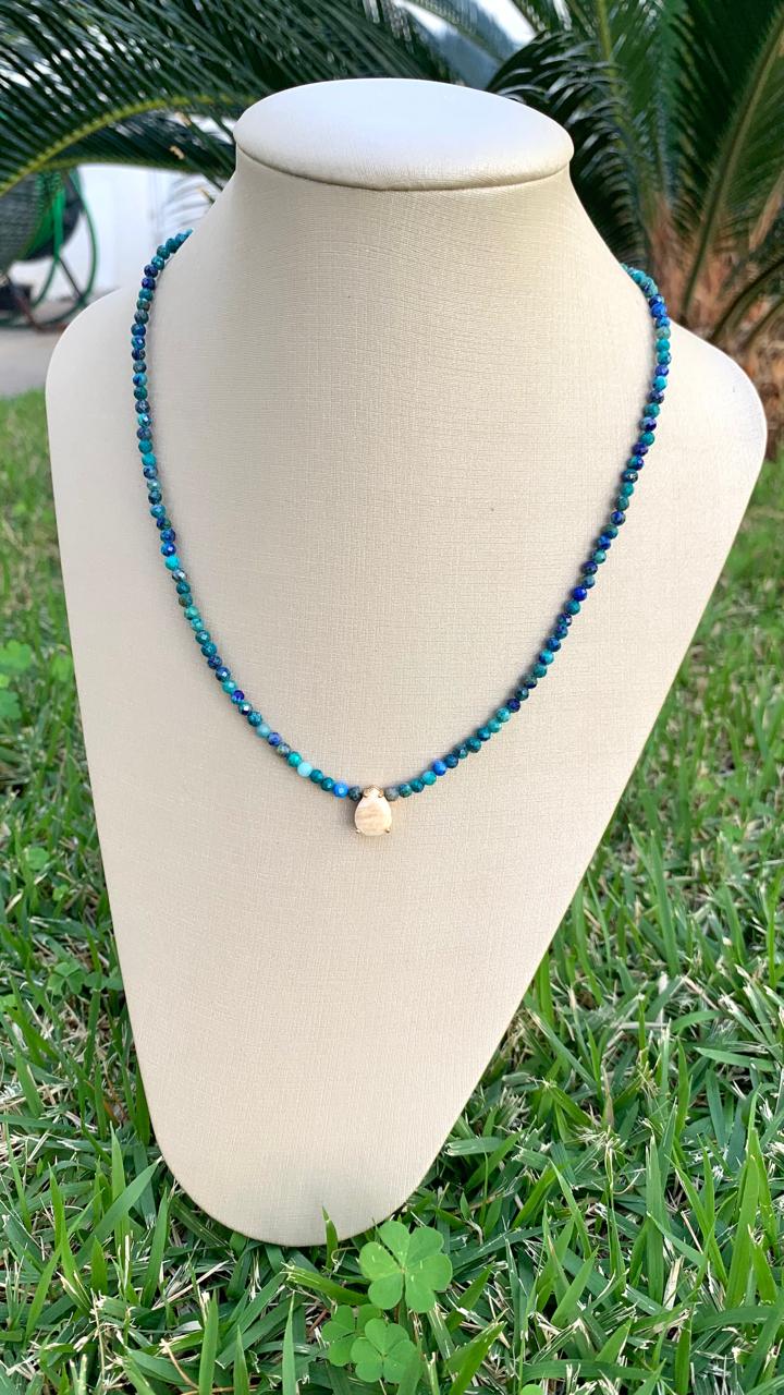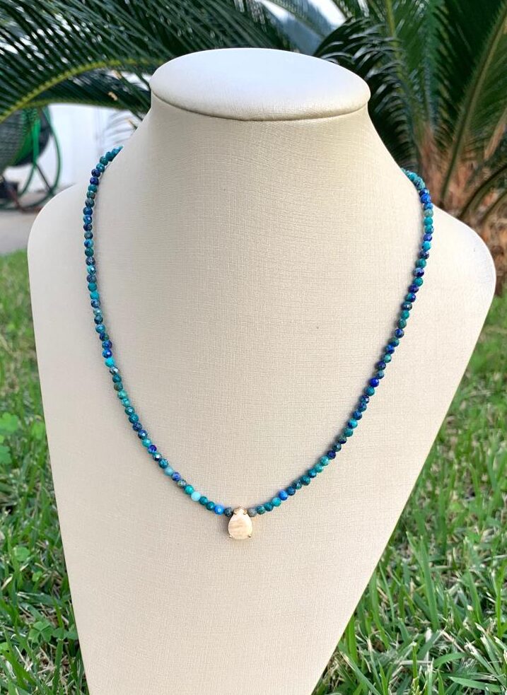 Colar pedra crisocola com pingente gota amazonita bege, banhado a ouro 18k.
