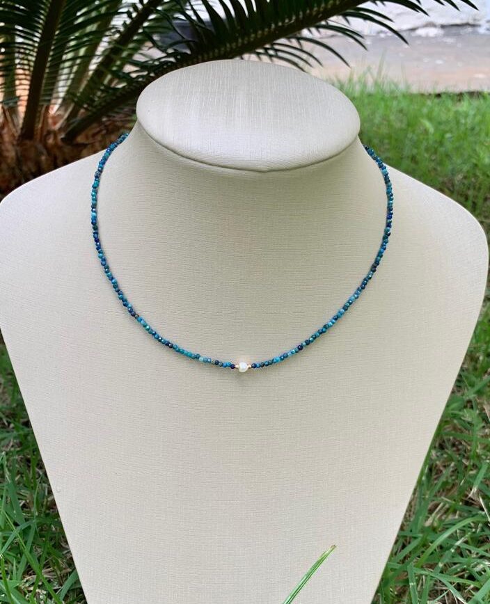 Colar de pedra natural crisocola com pingente de pérola, banhado a ouro18k.