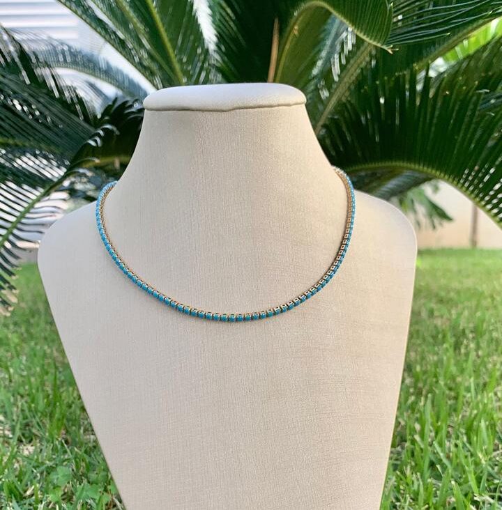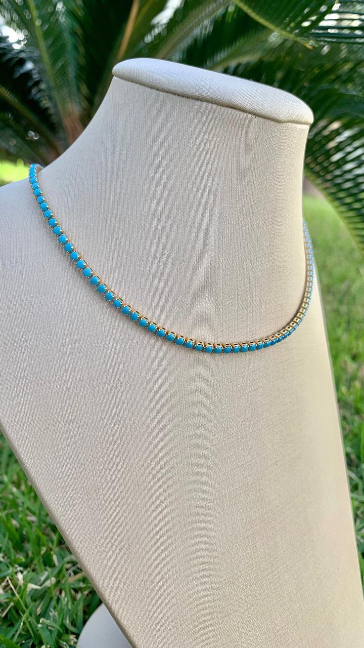 colar cristal turquesa, com 40cm, banhado a ouro 18k.