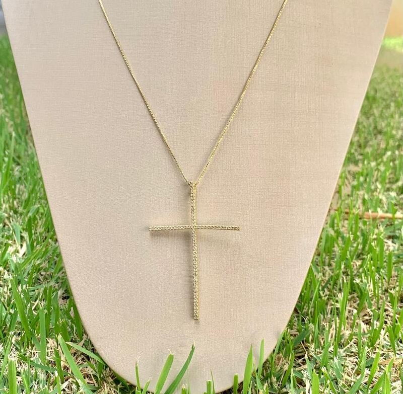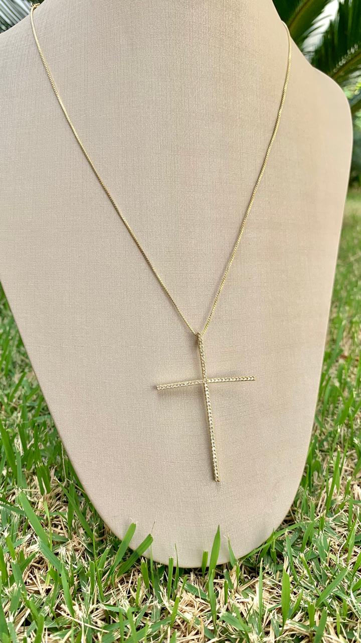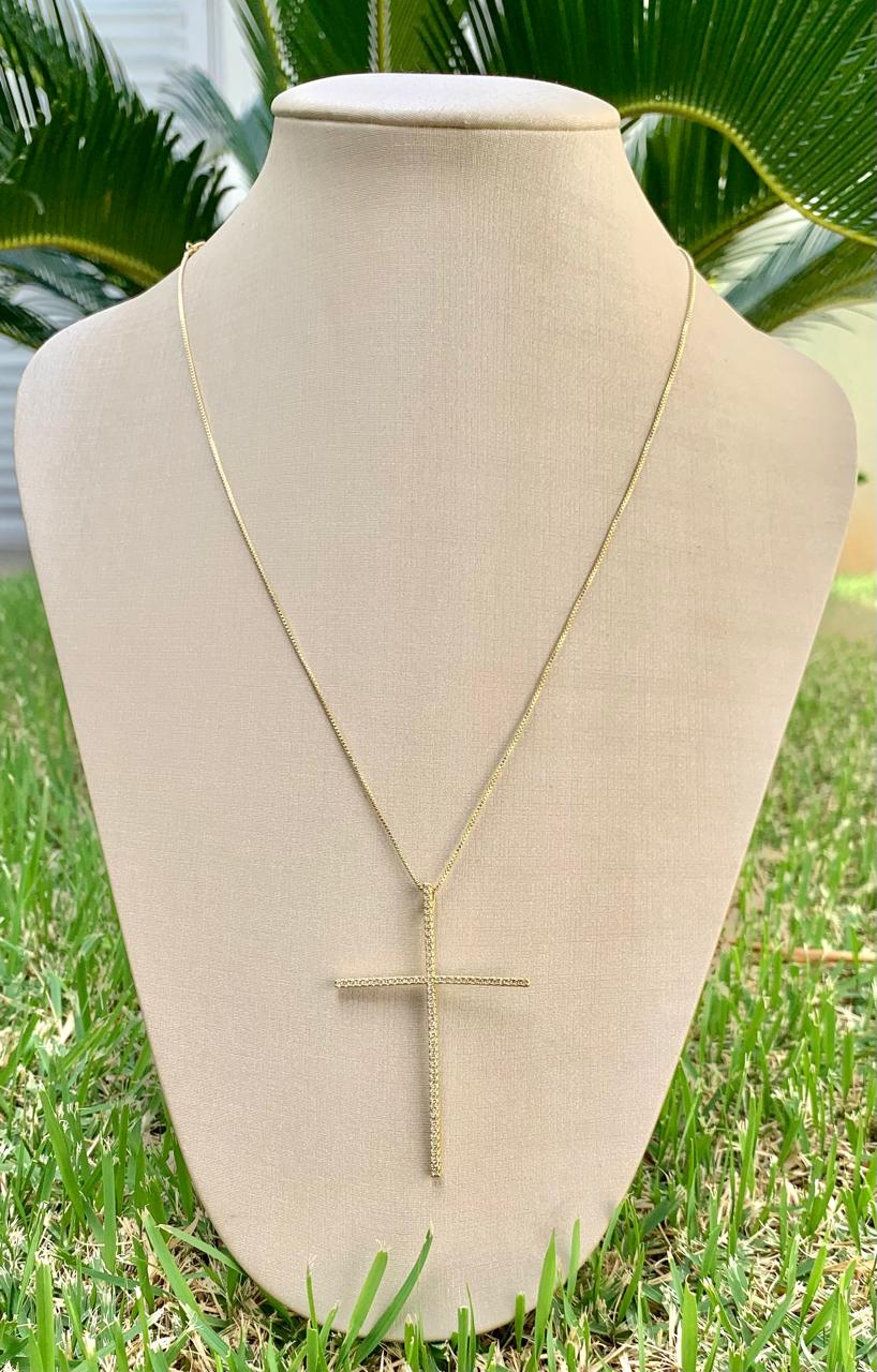 Colar crucifixo, cravejado de zircônias, banhado a ouro 18k.