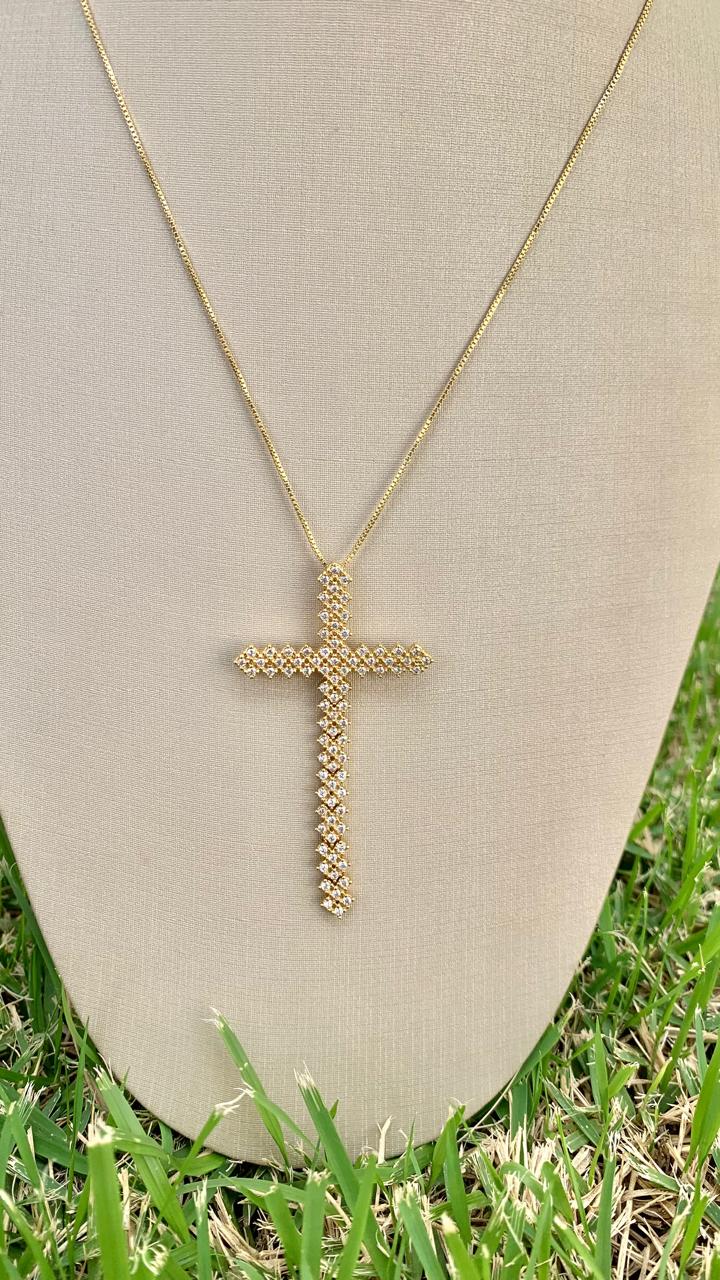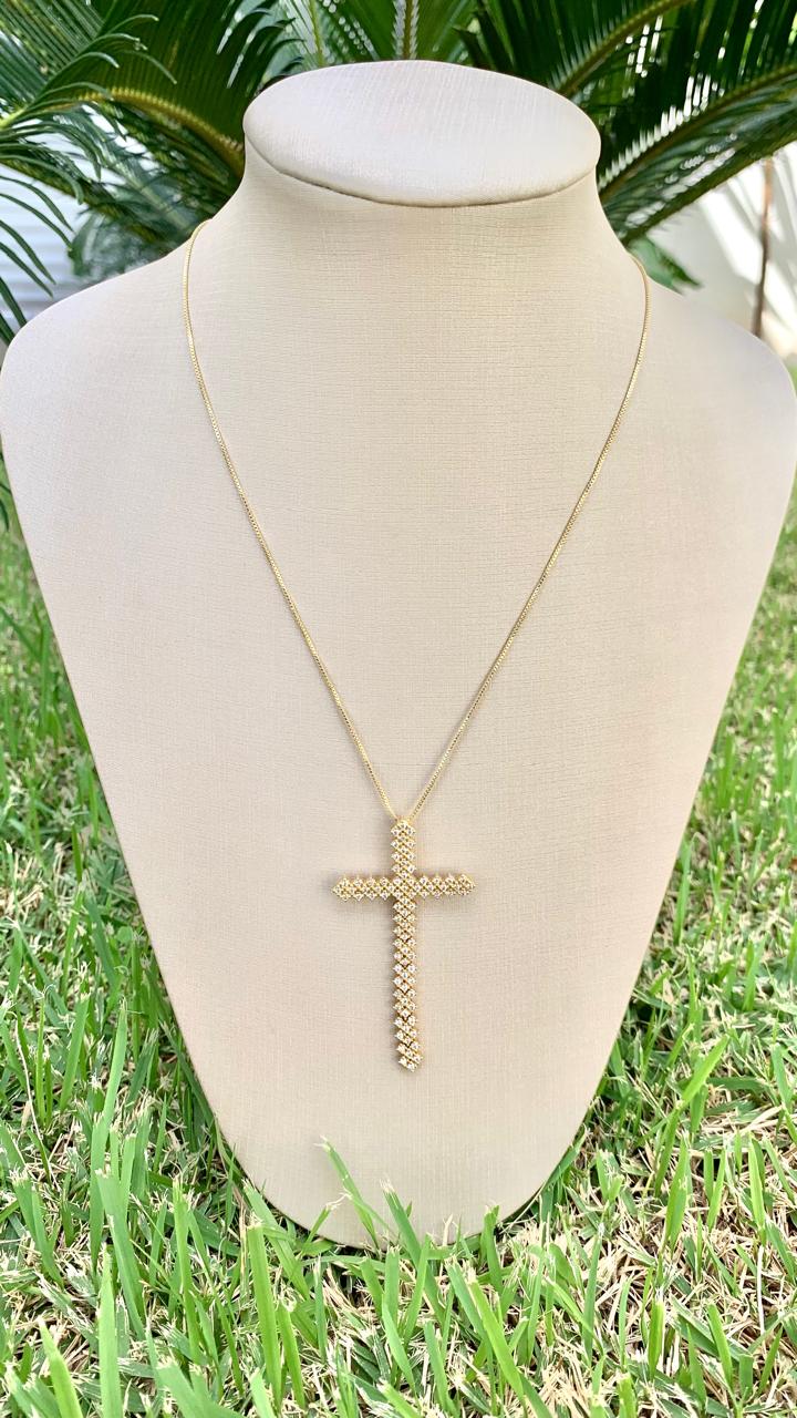 Colar crucifixo cm 45cm de comprimento, todo cravejado com zircônias brancas, banhado a ouro 18k.