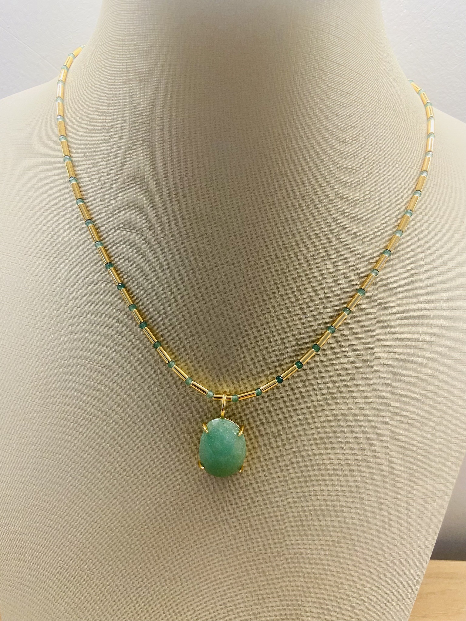 Colar de canutilho com pedra natural de quartzo verde entre os canutilhos, com pingente de quartzo verde, banhado a ouro 18K.