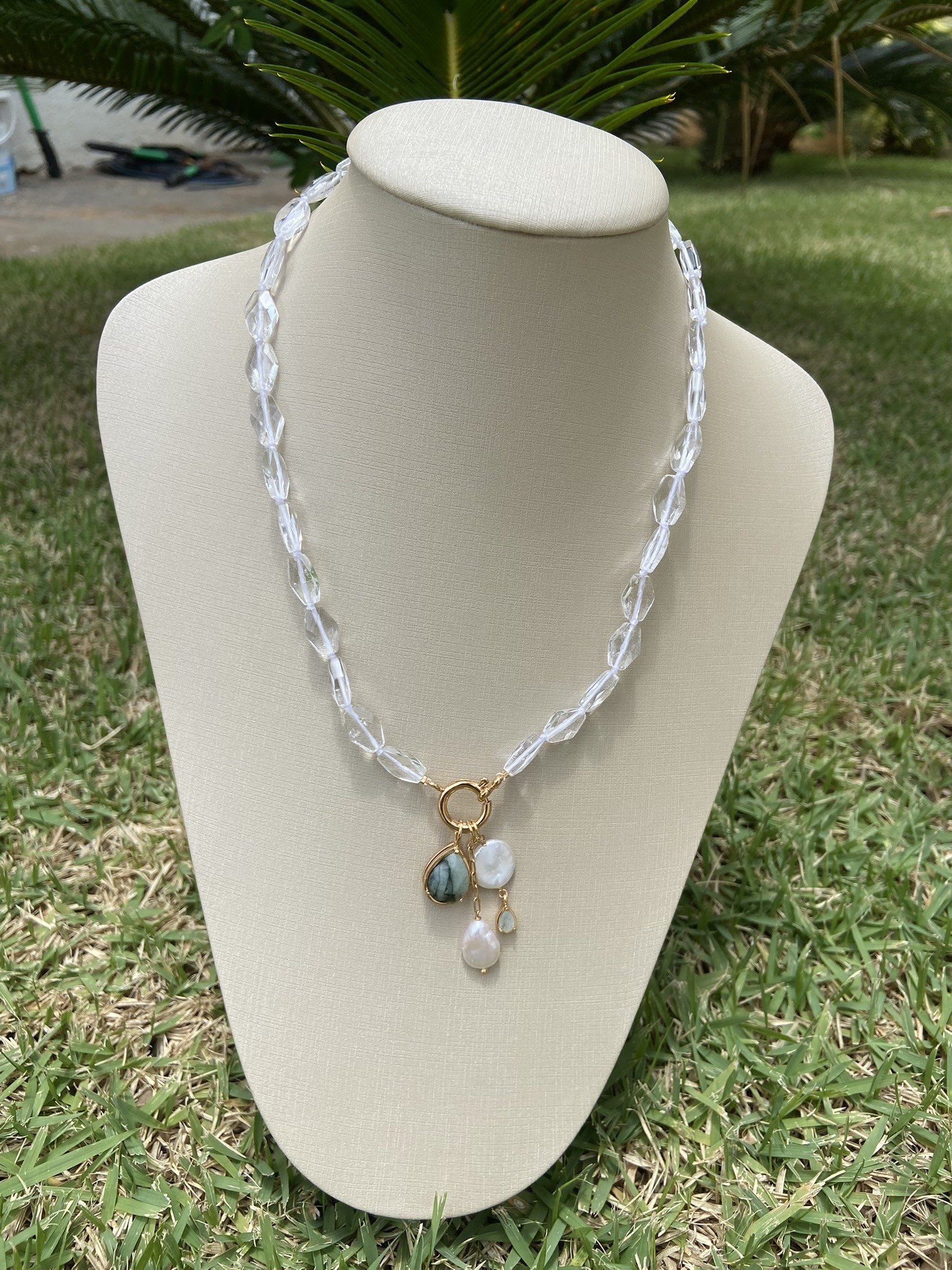 Colar de pedra natural de cristal, com pingentes de esmeralda e pérolas naturais, banhado a ouro18k.