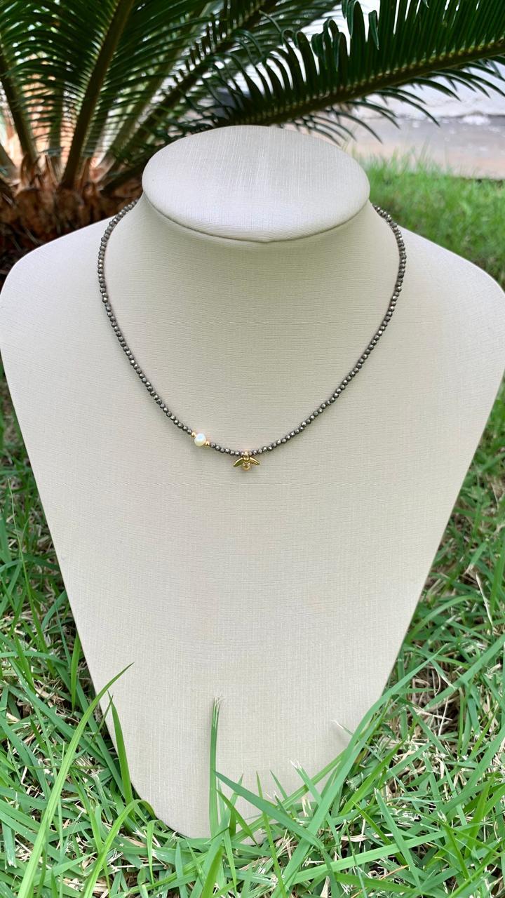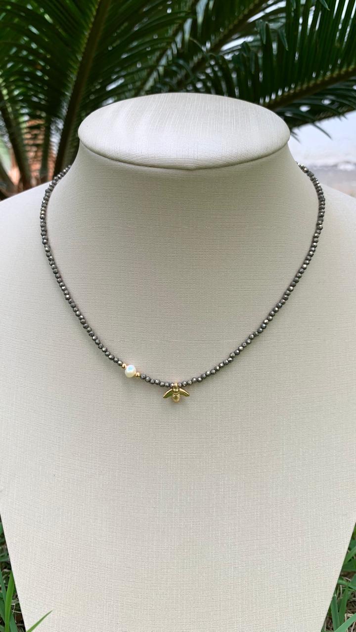 Colar de pirita com pérola e abelha, banhado a ouro18k.