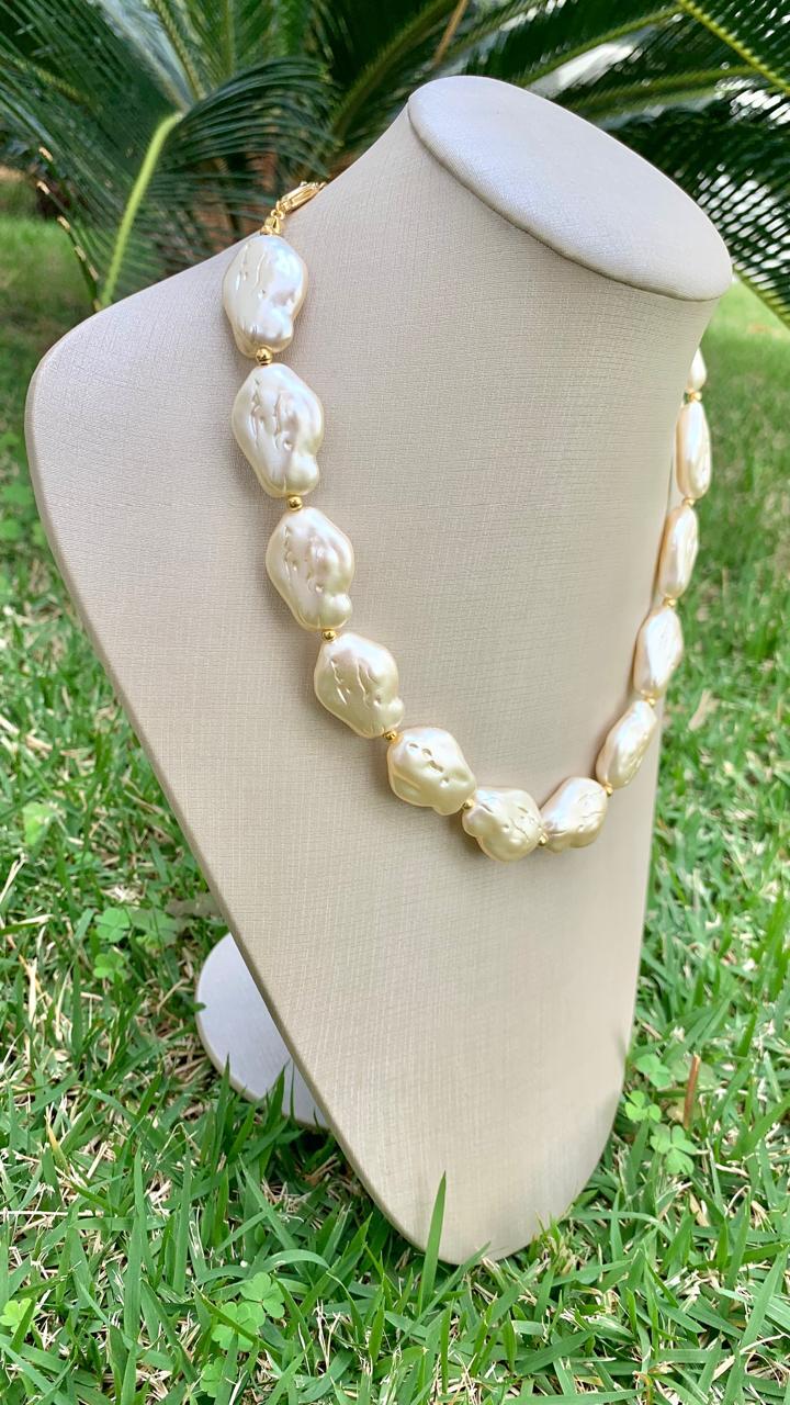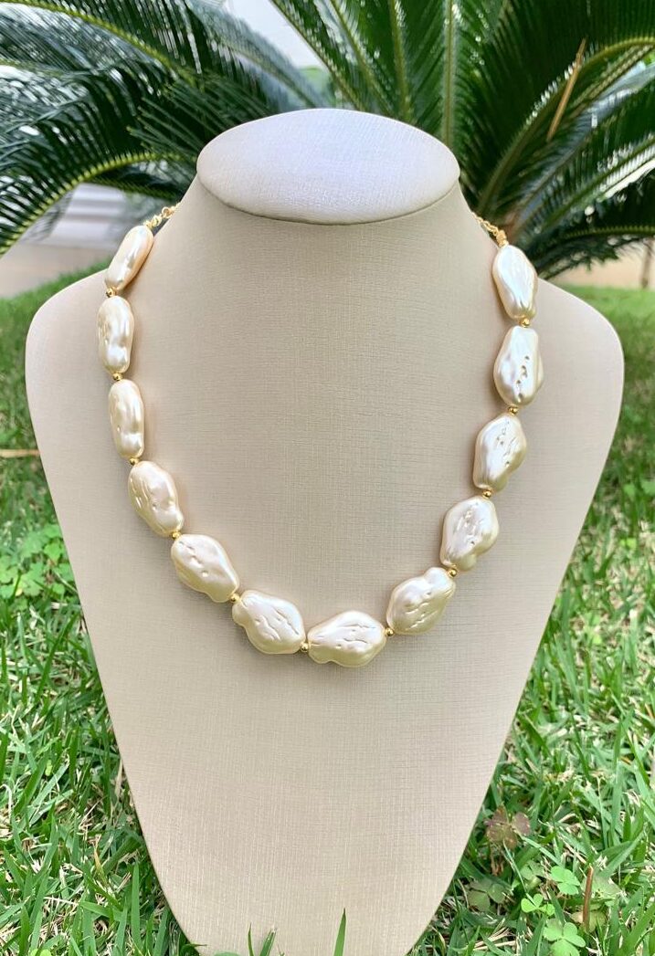Colar de pérolas sintéticas orgânicas grandes, com 40cm de comprimento, banhado a ouro18k.