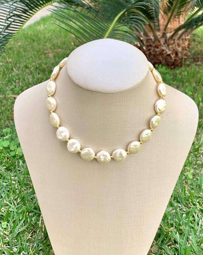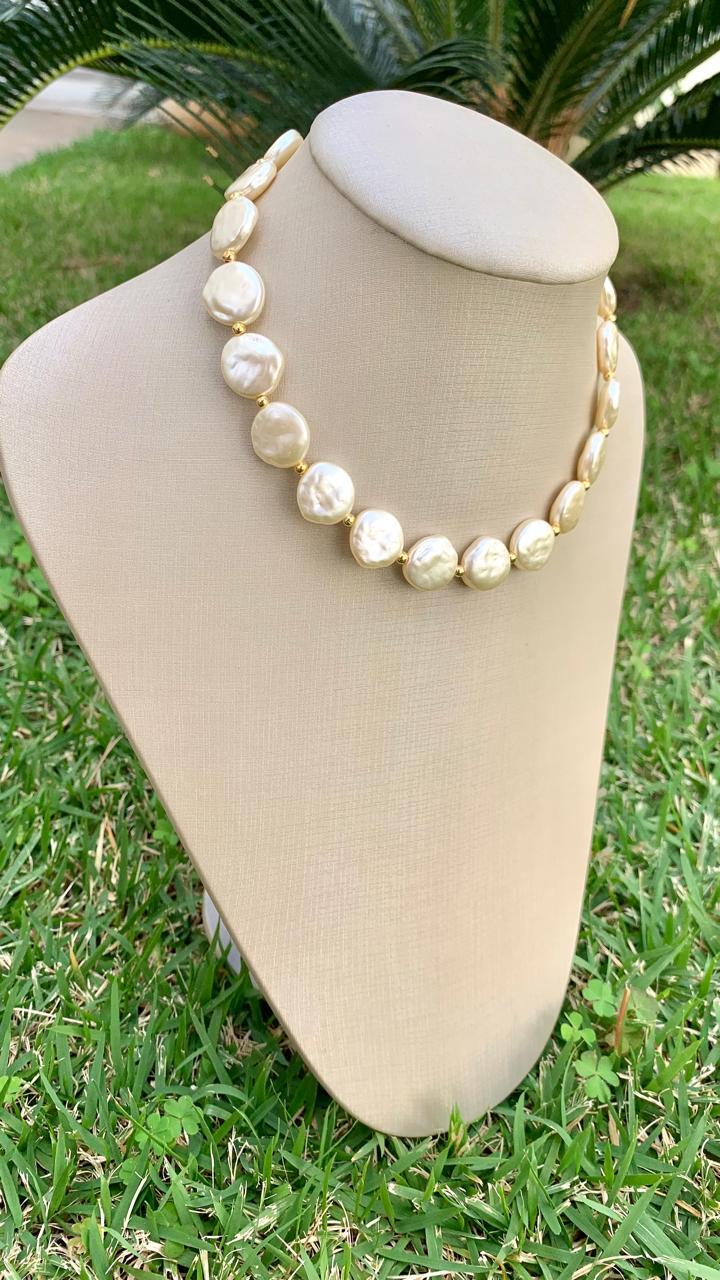 Colar de pérolas sintéticas redondas, banhado a ouro18k.