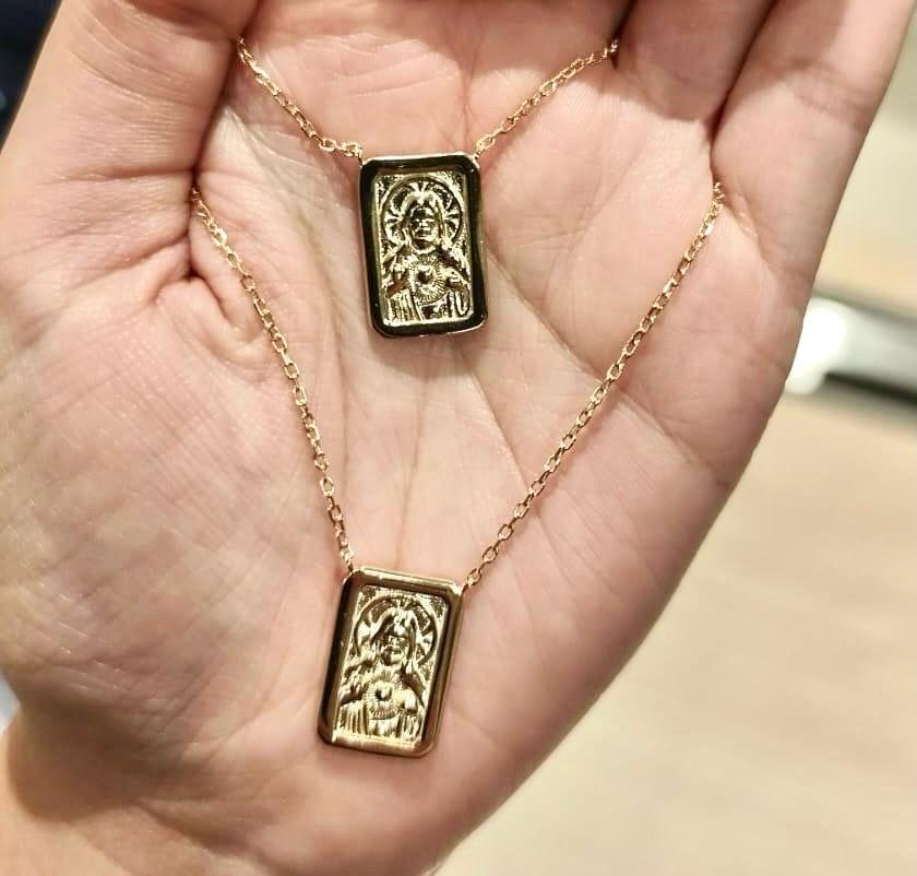 Colar escapulário, com 80cm de comprimento, em prata 925 com banho de ouro18k.