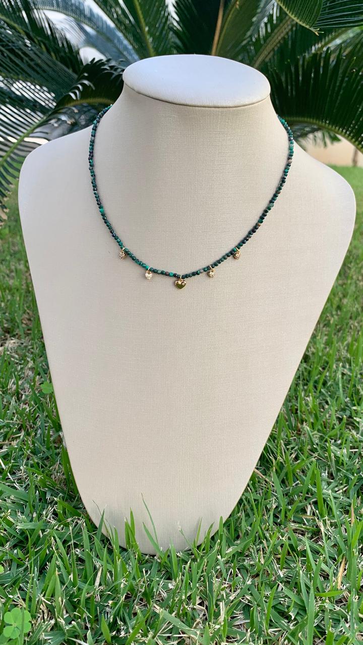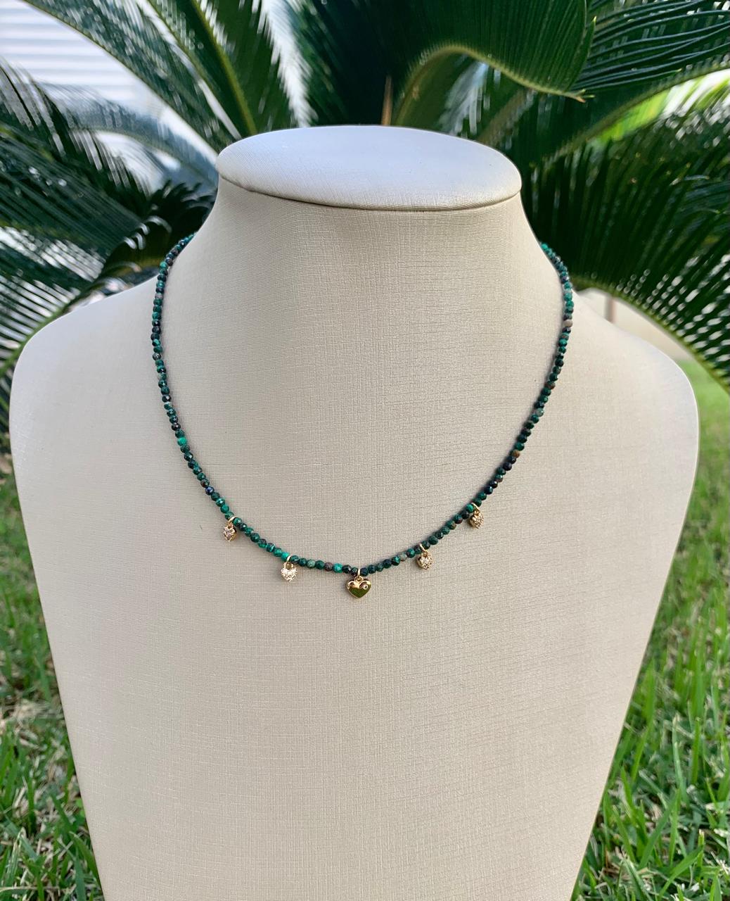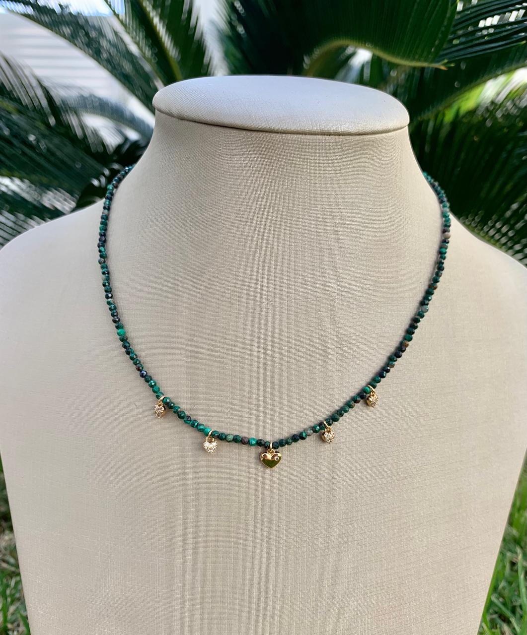 Colar de esmeralda africana com pingentes de corações, banhado a ouro 18k.