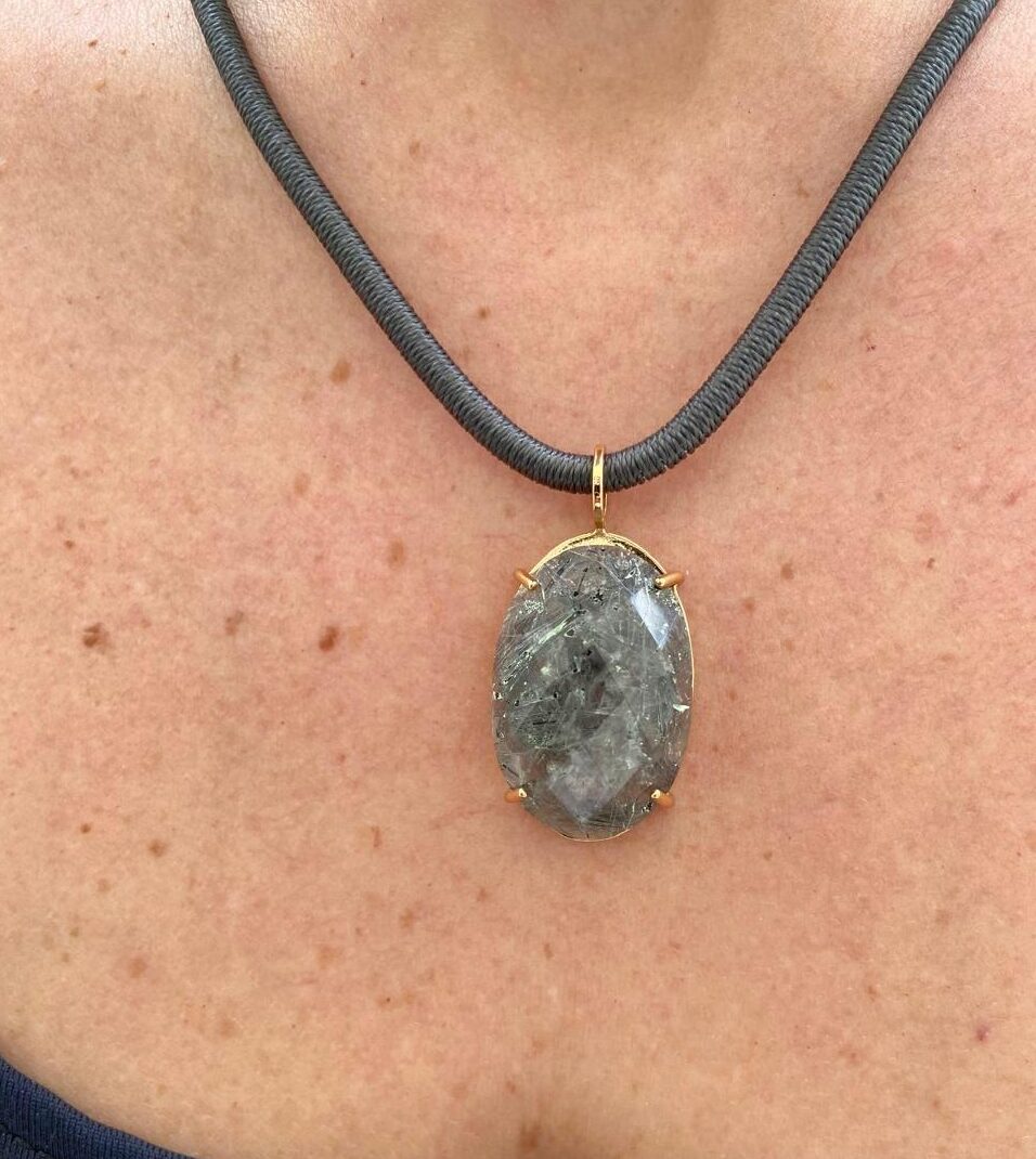 Colar fio de seda com pingente oval, de pedra natura de rútilo cinza, banhado a ouro 18k.