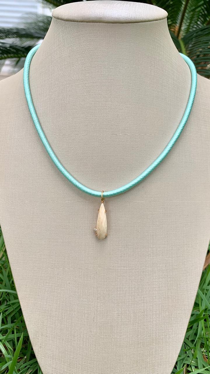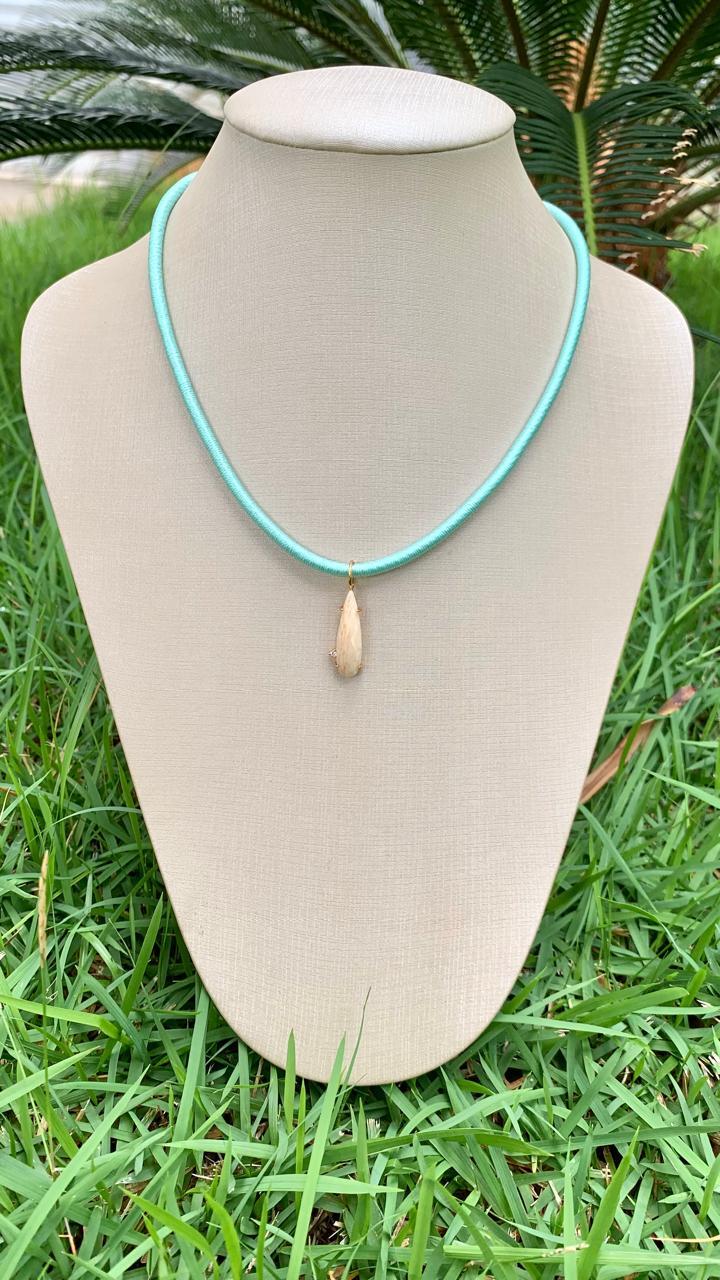 Colar fio de seda com pingente gota alongada feldspato, banhado a ouro18k.
