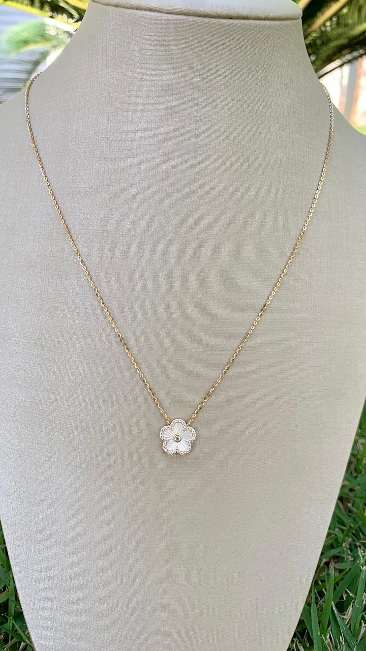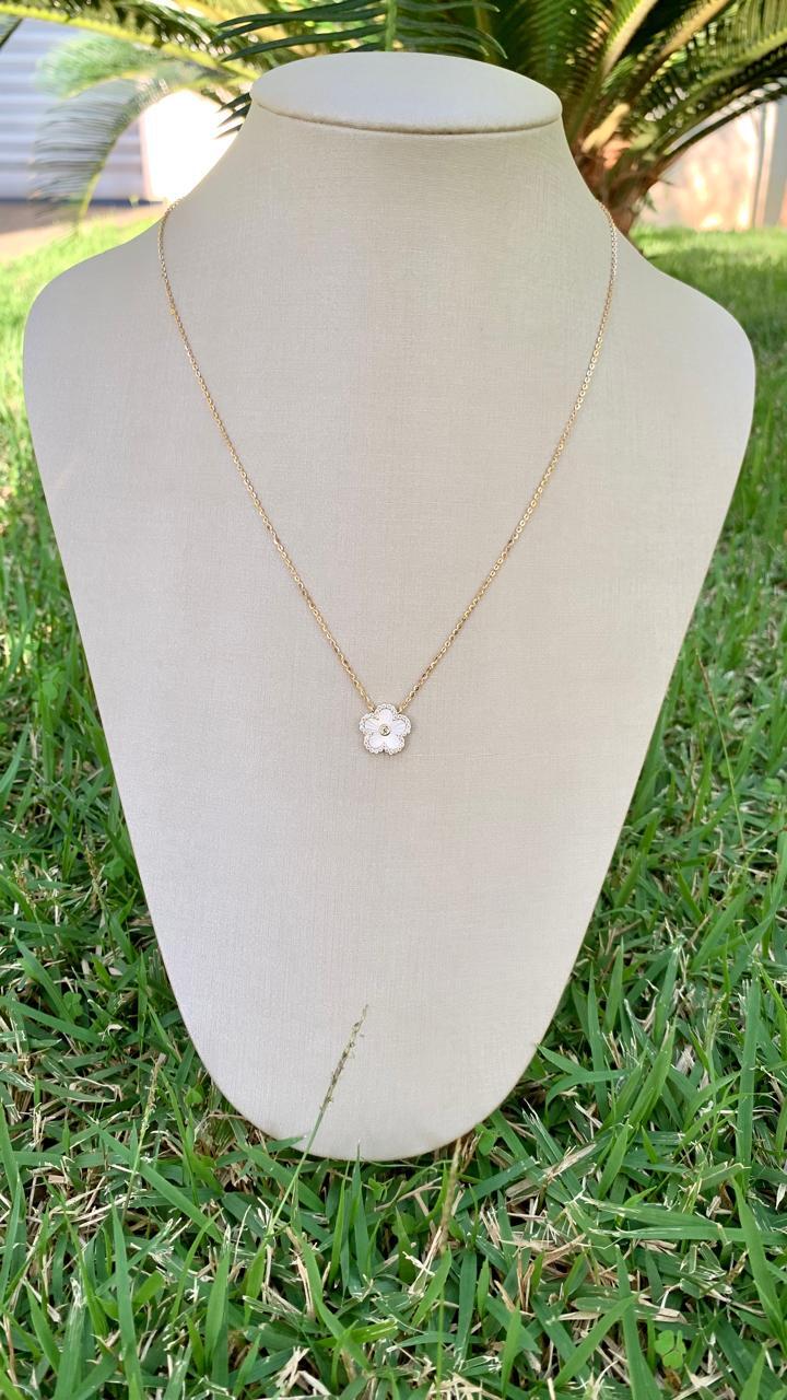 Colar Flor Madrepérola com ponto de luz, cravejado com zircônias brancas ao redor, em prata 925 e banho de ouro18k.