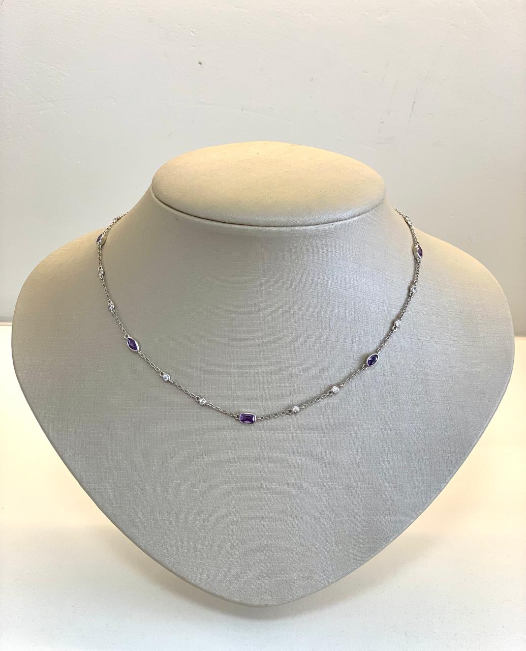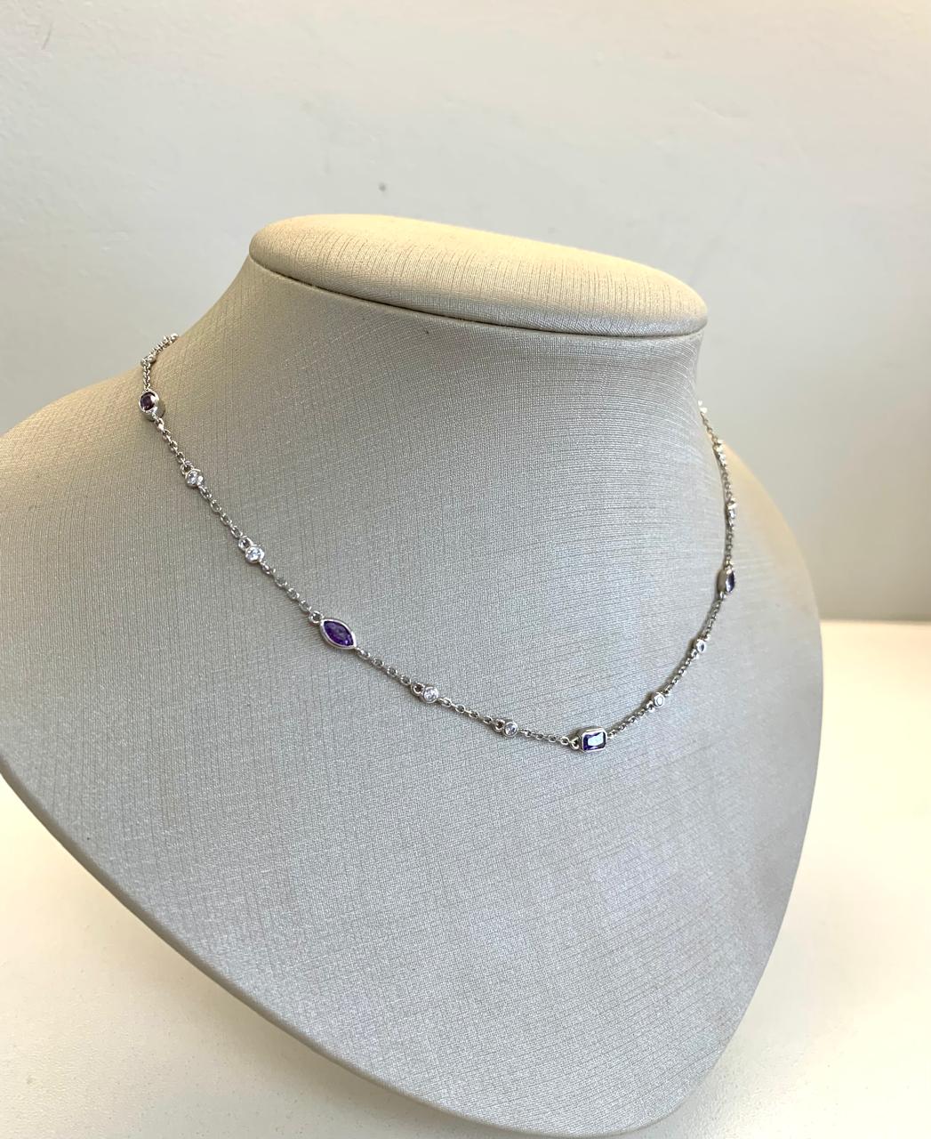 Colar de prata 925, com formas geométricas de tanzanita e pontos de luz.