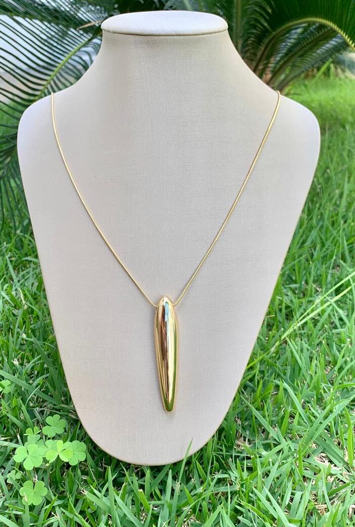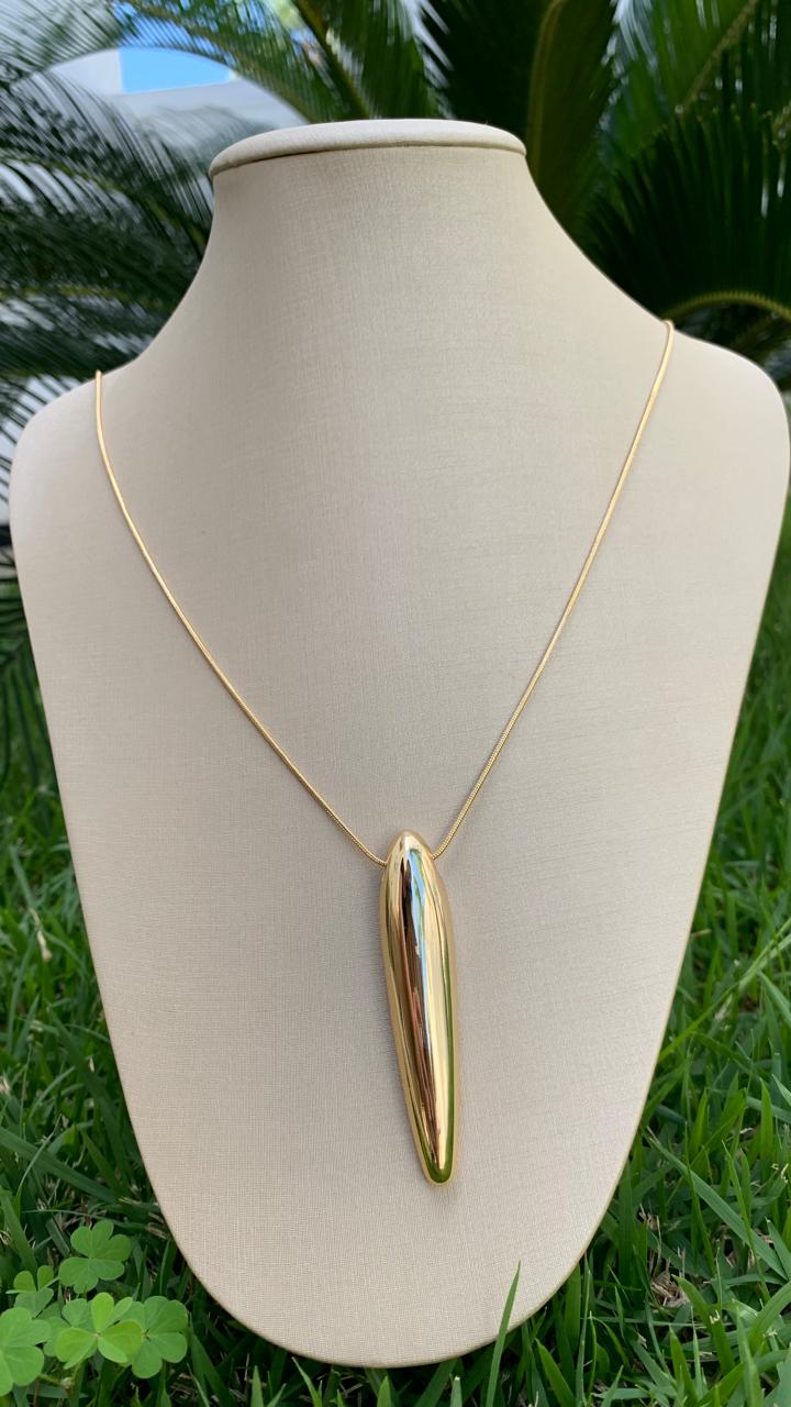 Colar gota alongada banhado a ouro 18k, com 75cm de comprimento.