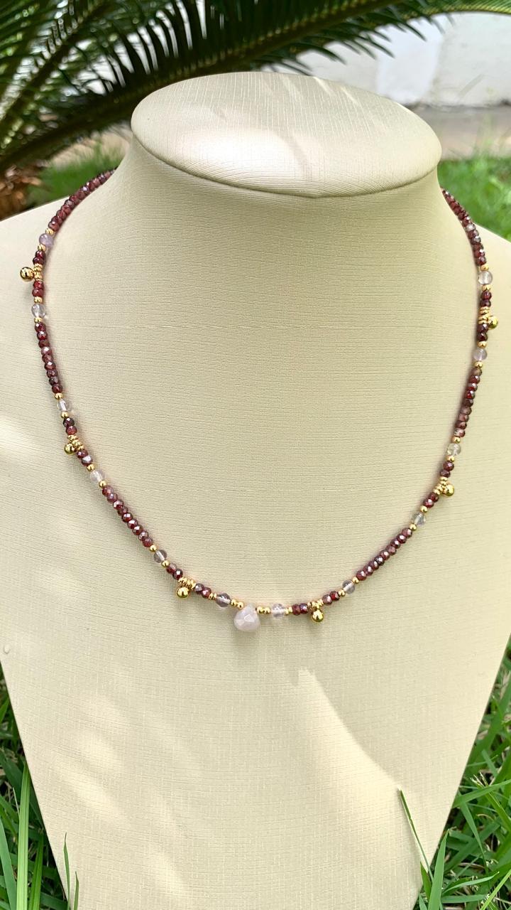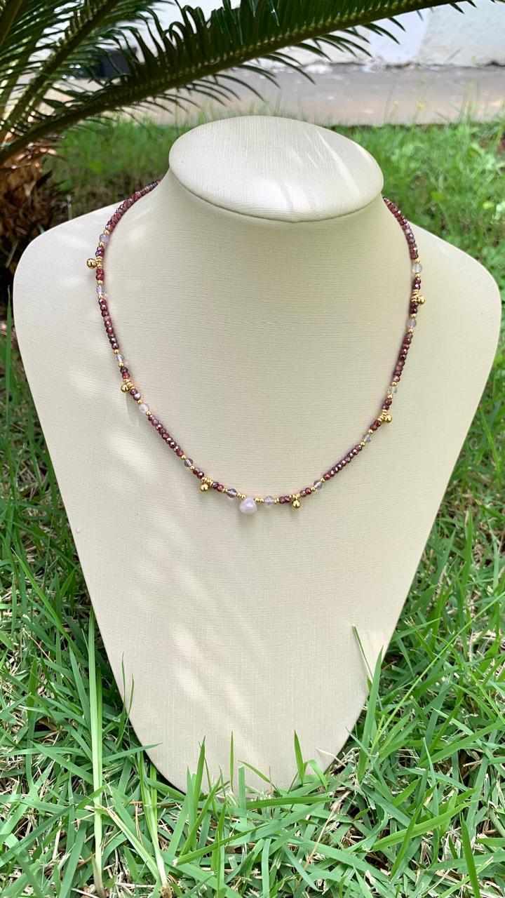 Colar de pedra naturais granada, ametista e quartzo goiaba, banhado a ouro18k.