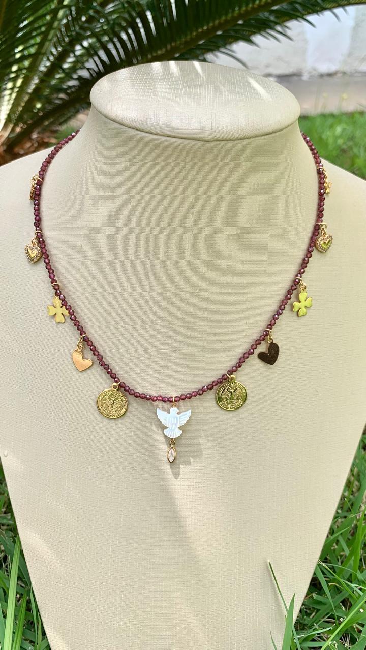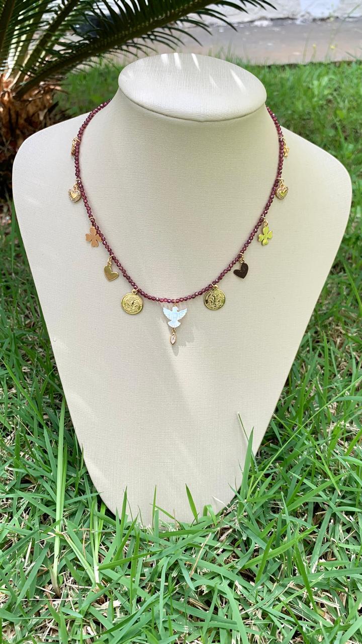 Colar de pedra natural granada com pingentes de coração, trevo de 4 folhas, coração cravejado de zircônias, Espírito Santo e medalha dos eua, banhado a ouro18k.
