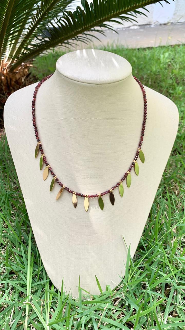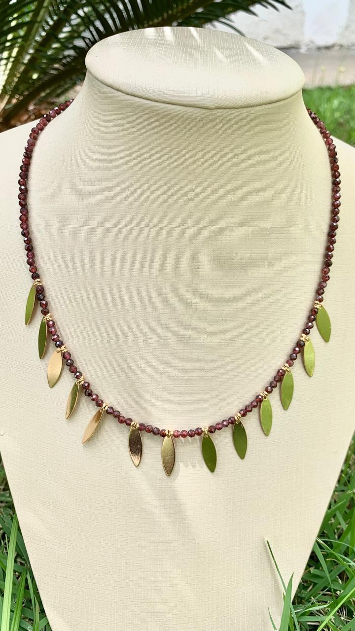 Colar  de pedra natural granada com pingente de folhas, banhado a ouro18k.