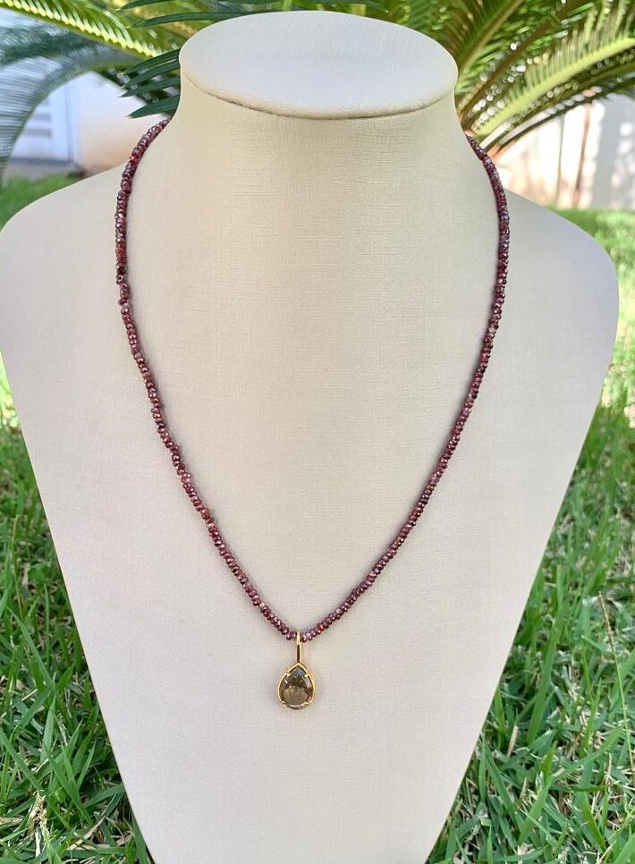 colar granada com pingente de gota quartzo fume, banhado a ouro18k.