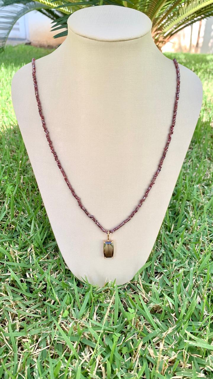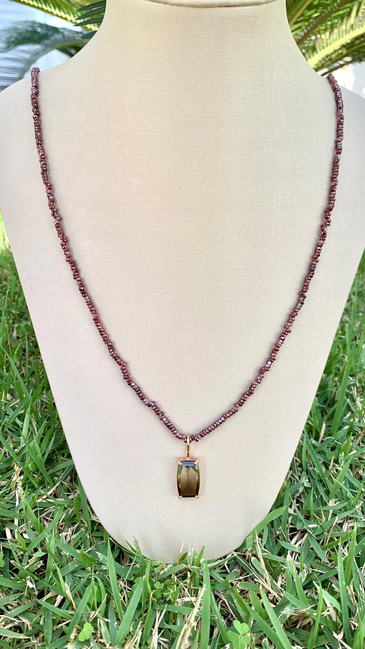 Colar com 70cm de comprimento, de granada com pingente quartzo fume, banhado a ouro18k.